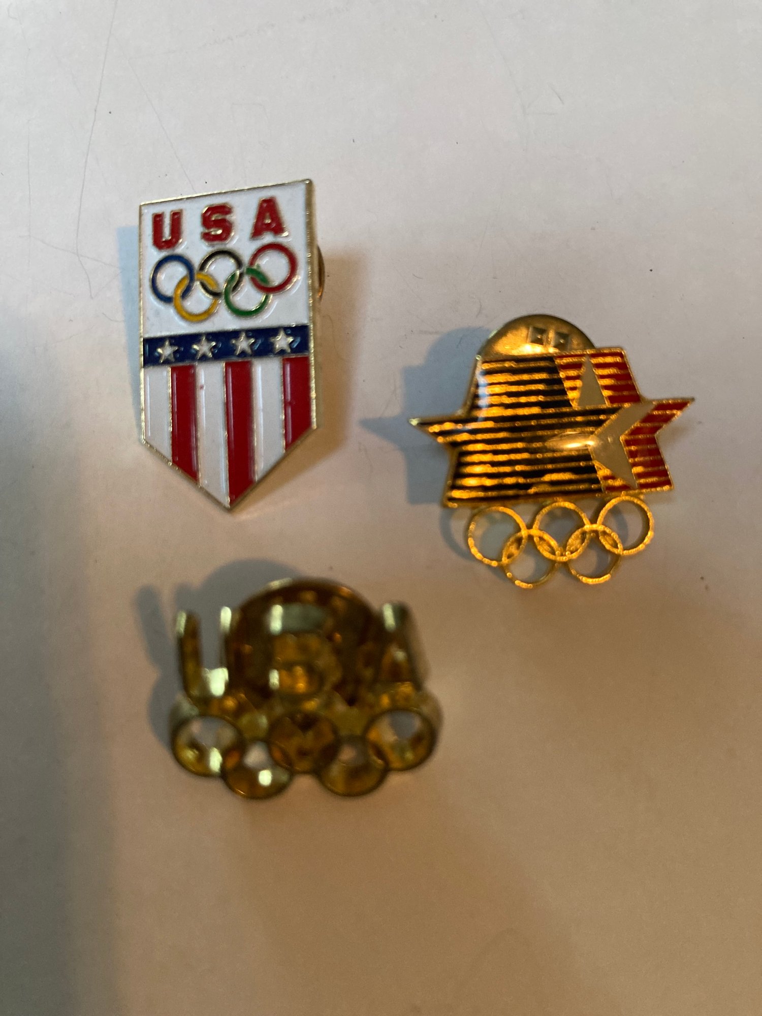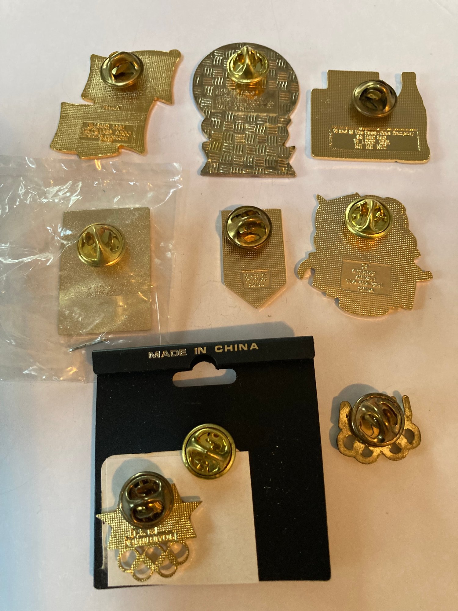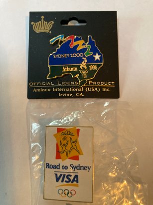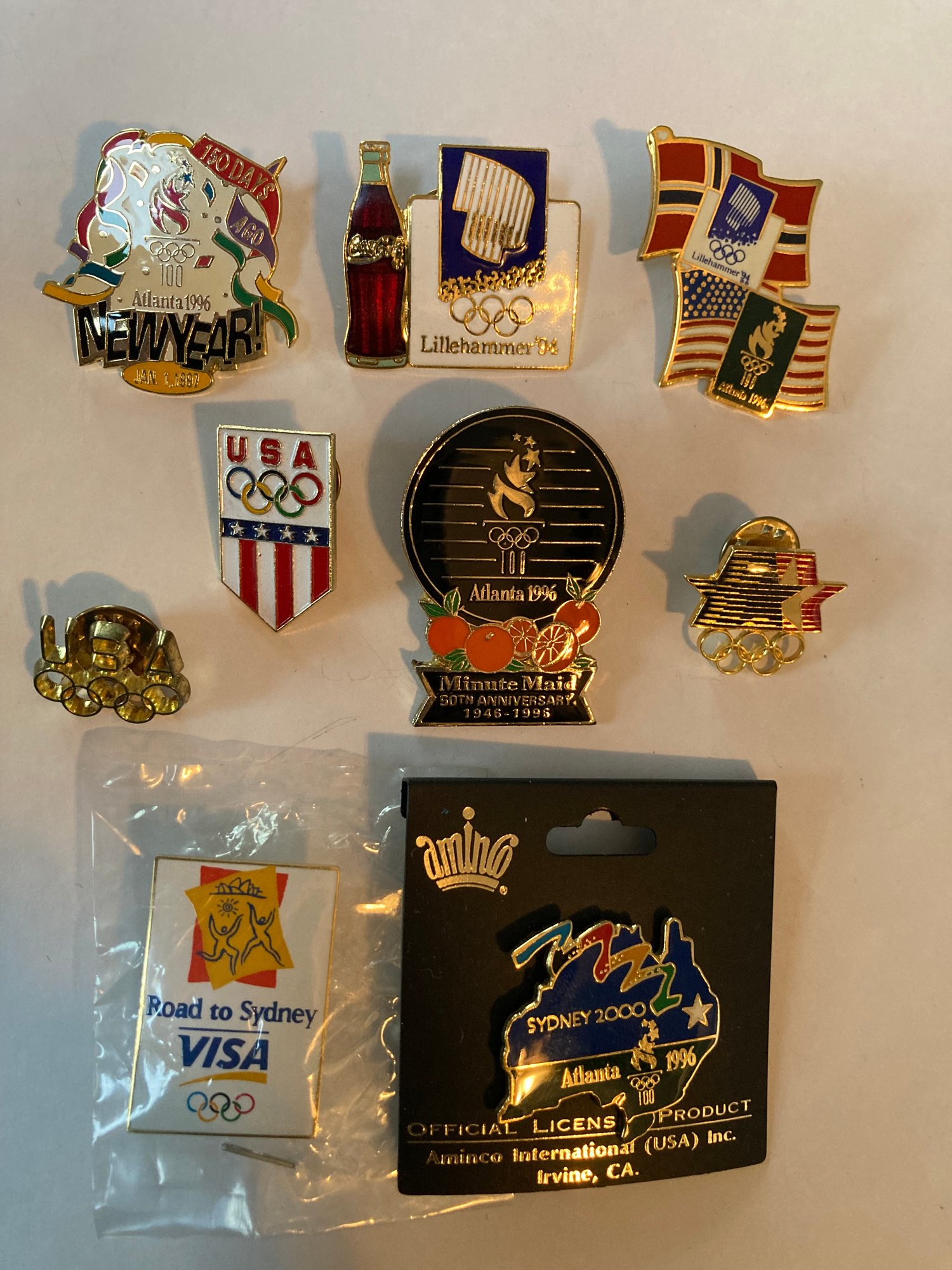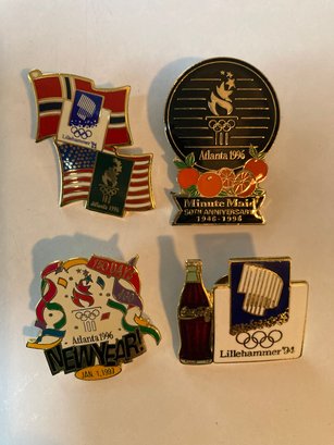 Commemorative Olympic pins including 1994 Lillehammer, 1996 Atlanta, 2000 Sydney