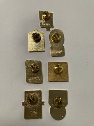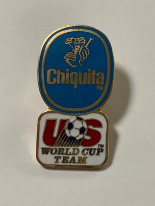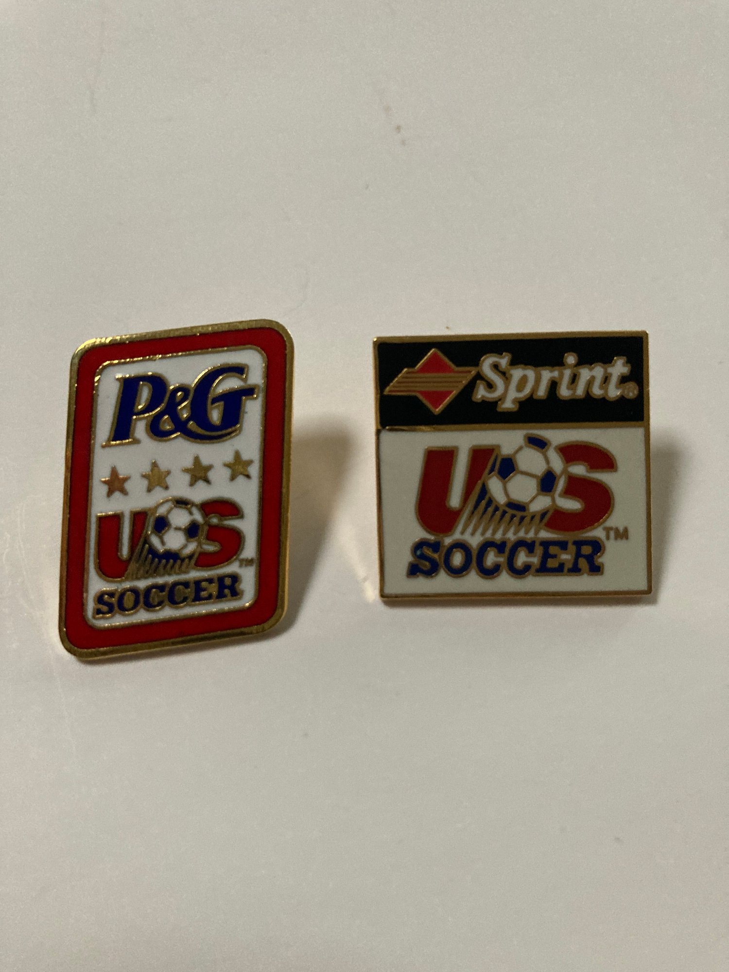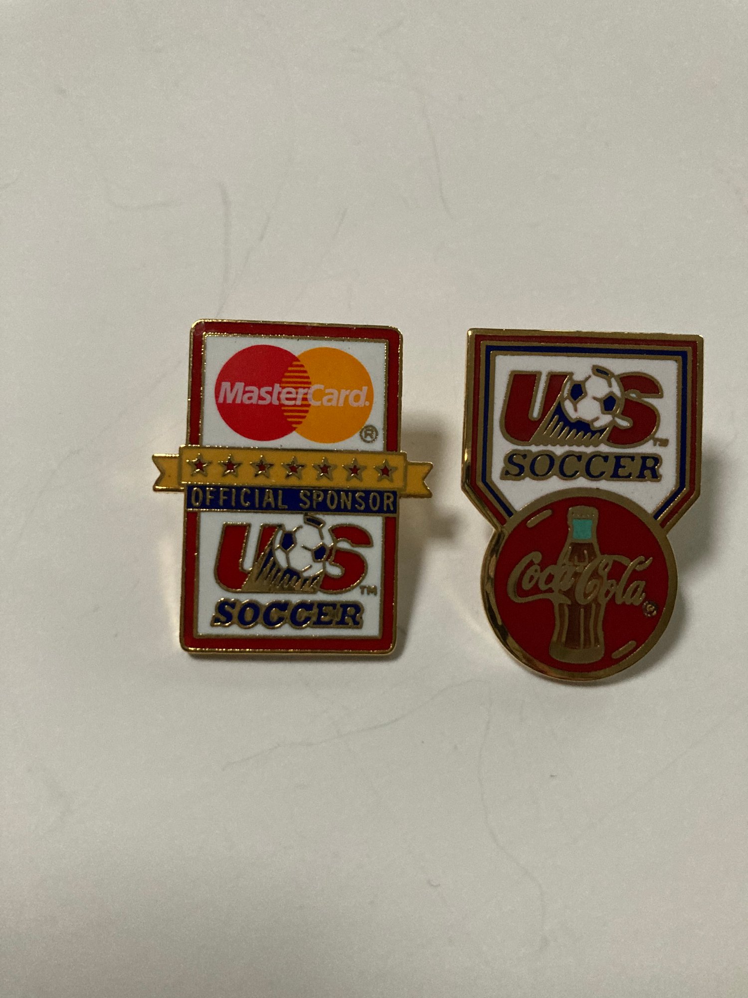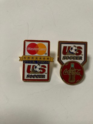 Set of 7 enameled corporate sponsor pins for US Soccer. Includes Mastercard, Sprint, P & G, Chiquita, Upper Deck, Coca Cola and Hawaiian Punch. All have the backs attached and are in good condition. Photographs are part of the description.