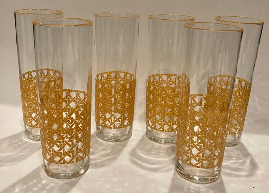 Outstanding set of six Woven Cane glasses by Libbey. They date from the 1960’s and are in like new condition. Glasses measure 7” tall with a 2.5” opening. The pattern is a nice goldenrod color.