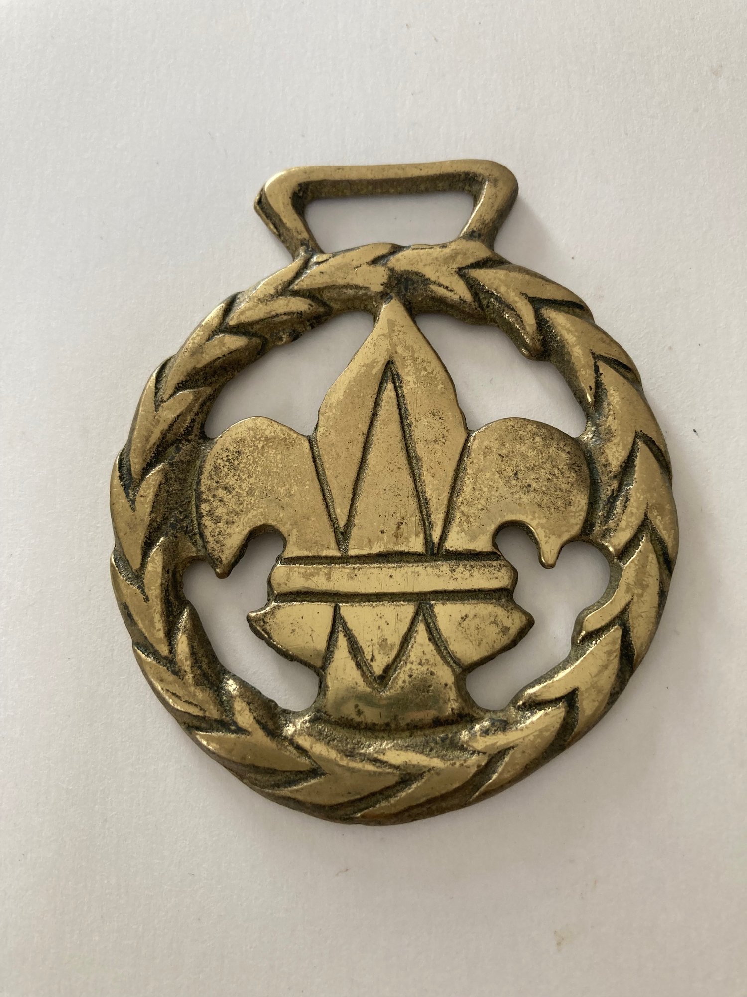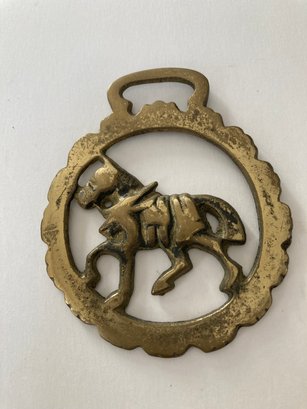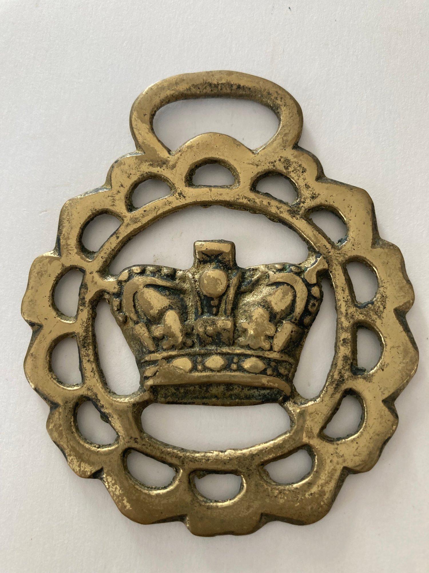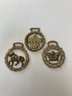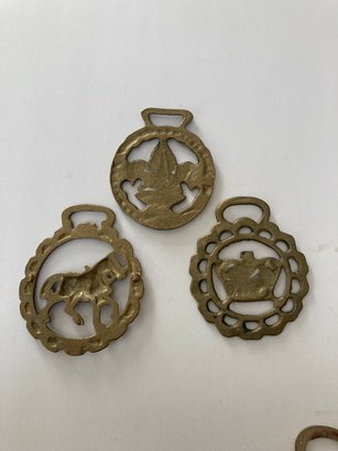 Horse brass medallions from England depicting a horse, a crown and a fleur de lis.