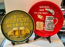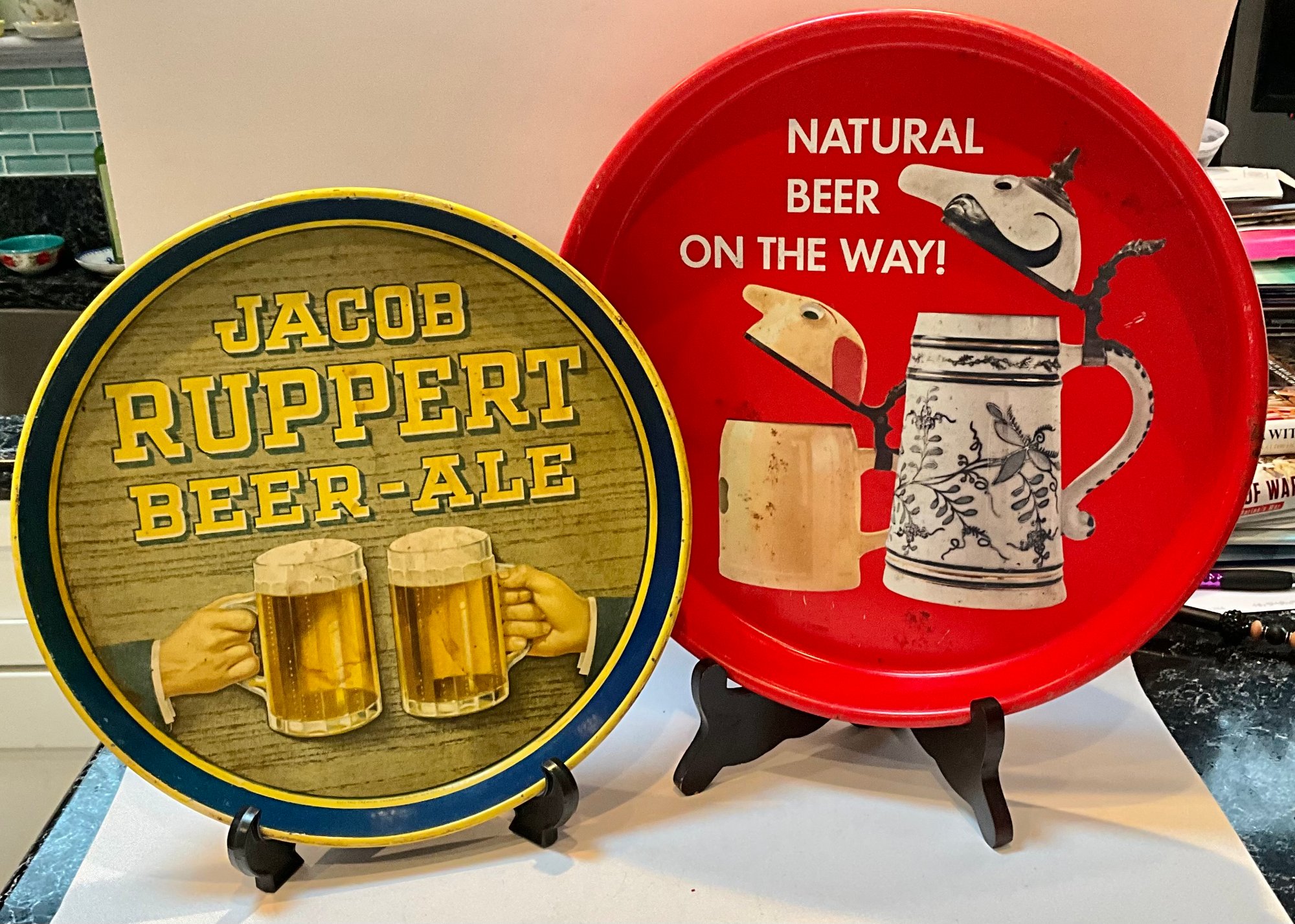 Jacob Ruppert Beer-Ale serving tray made by Electro Chemical Engraving Co., Inc. New York NY. Measures 12” across. It shows two hands holding two mugs of beer. The second tray is predominately red with two steins with “Natural Beer On The Way” and ” Utica Club” around the outside. It measures 13”. Please see all photos as they are part of the description.