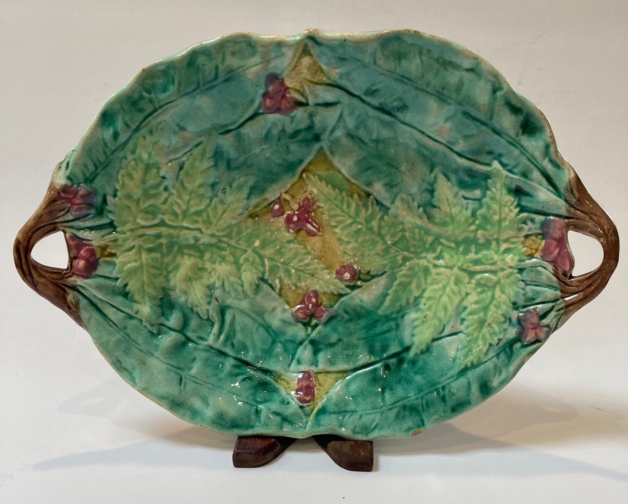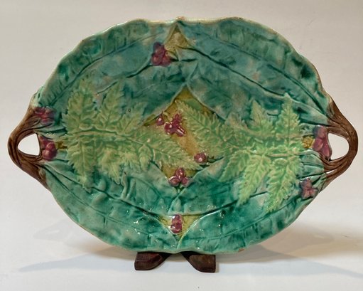 Beautiful majolica dish with fern leaves and pink berries on a green background. The handles resemble brown twigs. The dish measures 12” long, 8” wide and 1 1/2” high. There is a small chip on the back and a loss of glaze on the edge of the front. Some of the berries are missing glaze. Please see the photos for further clarification. Crazing exists consistent with age. Estimated date of manufacture is 1870’s.