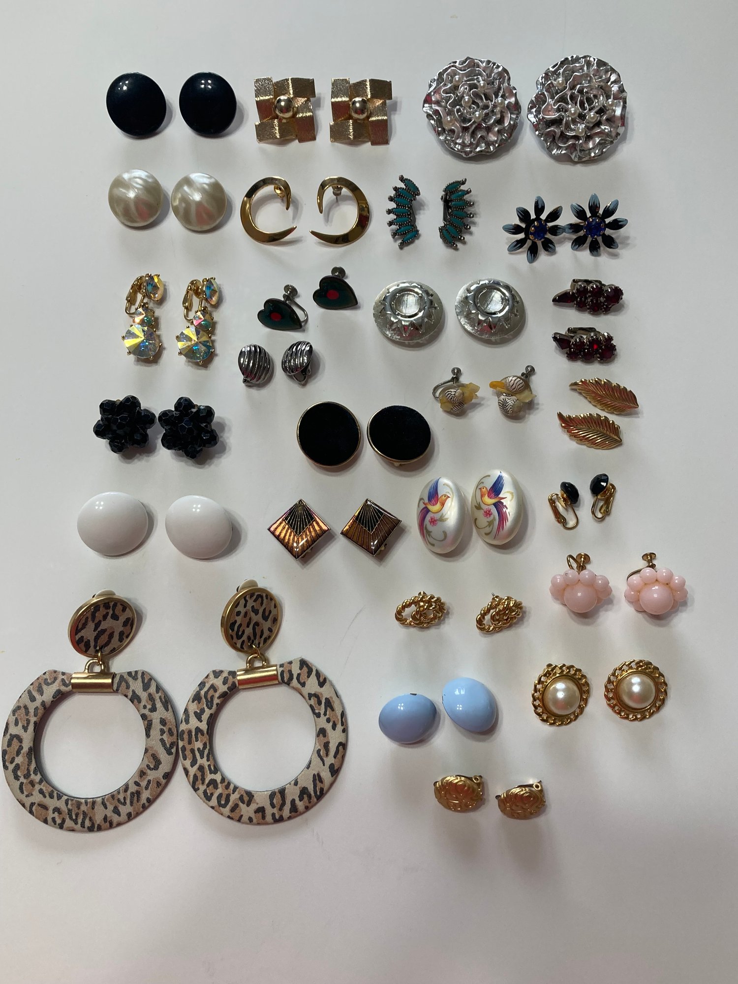 A nice collection of unmarked costume jewelry consisting of 11 necklaces, 26 pairs of earrings, mostly clip, 5 bracelets, 1 watch (no band), 3 pins and one scarf clip