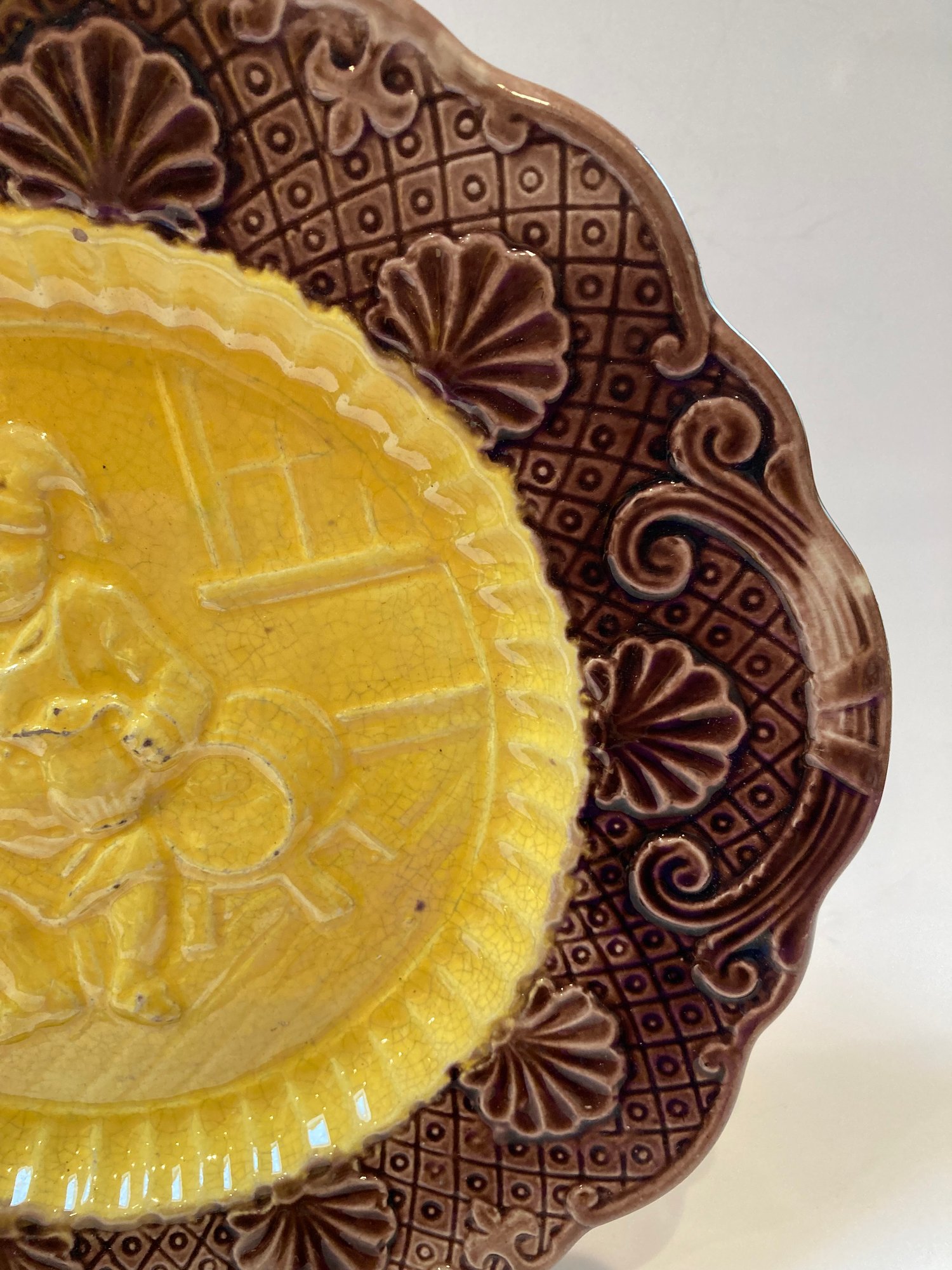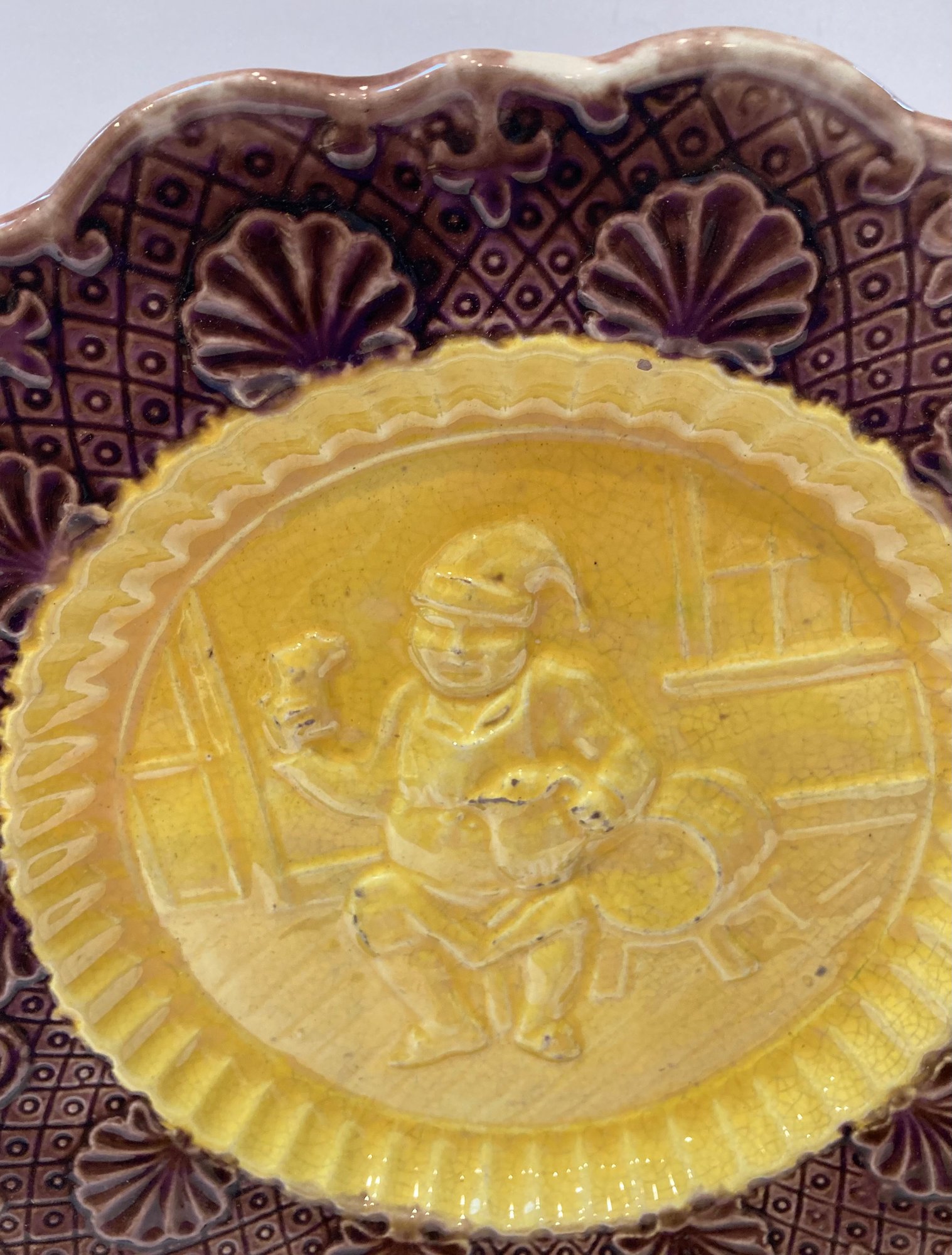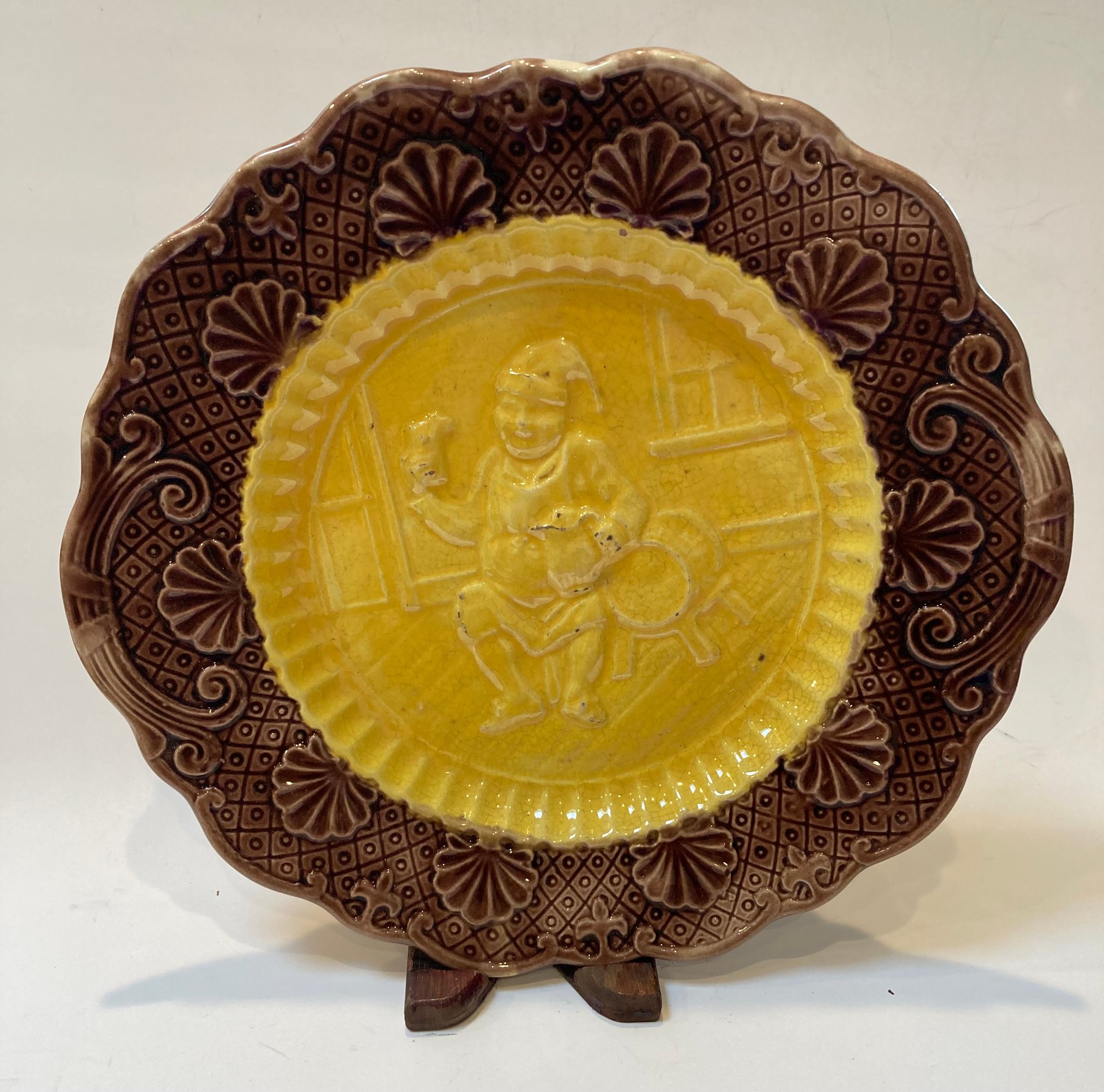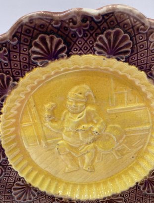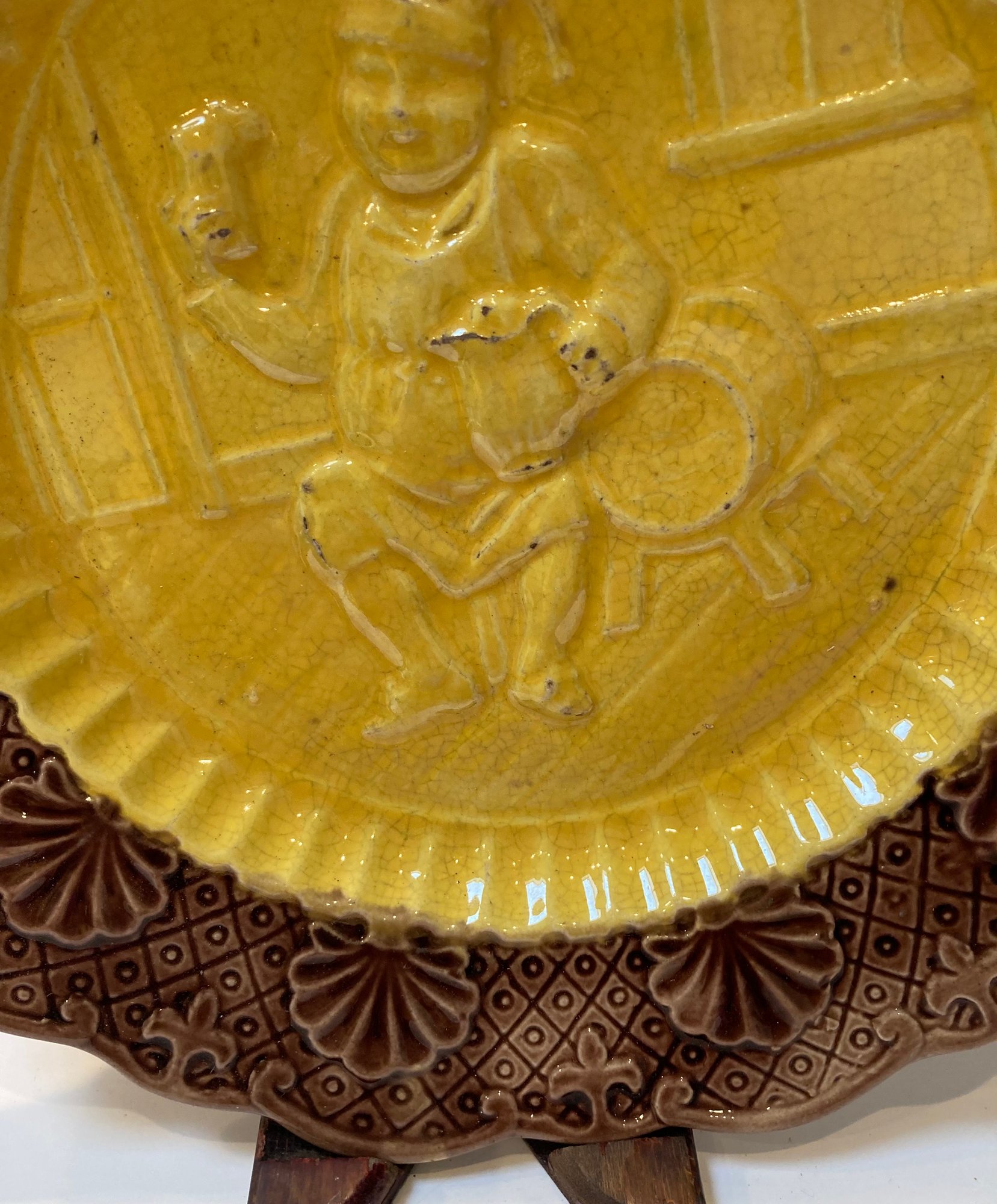Heavy majolica plate by Villeroy & Boch showing an innkeeper serving beer from a barrel. The plate measures 11” in diameter. There are no chips or cracks, some loss of glaze from the innkeeper and some crazing consistent with age. There is a wide brown border of shells and fleur de lis. The estimated date of manufacture is 1880.
