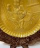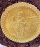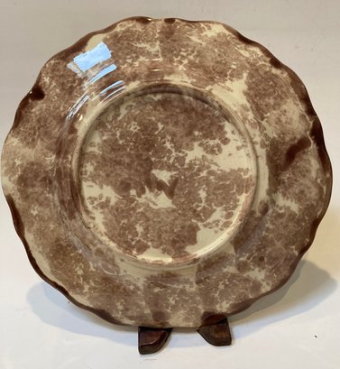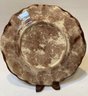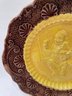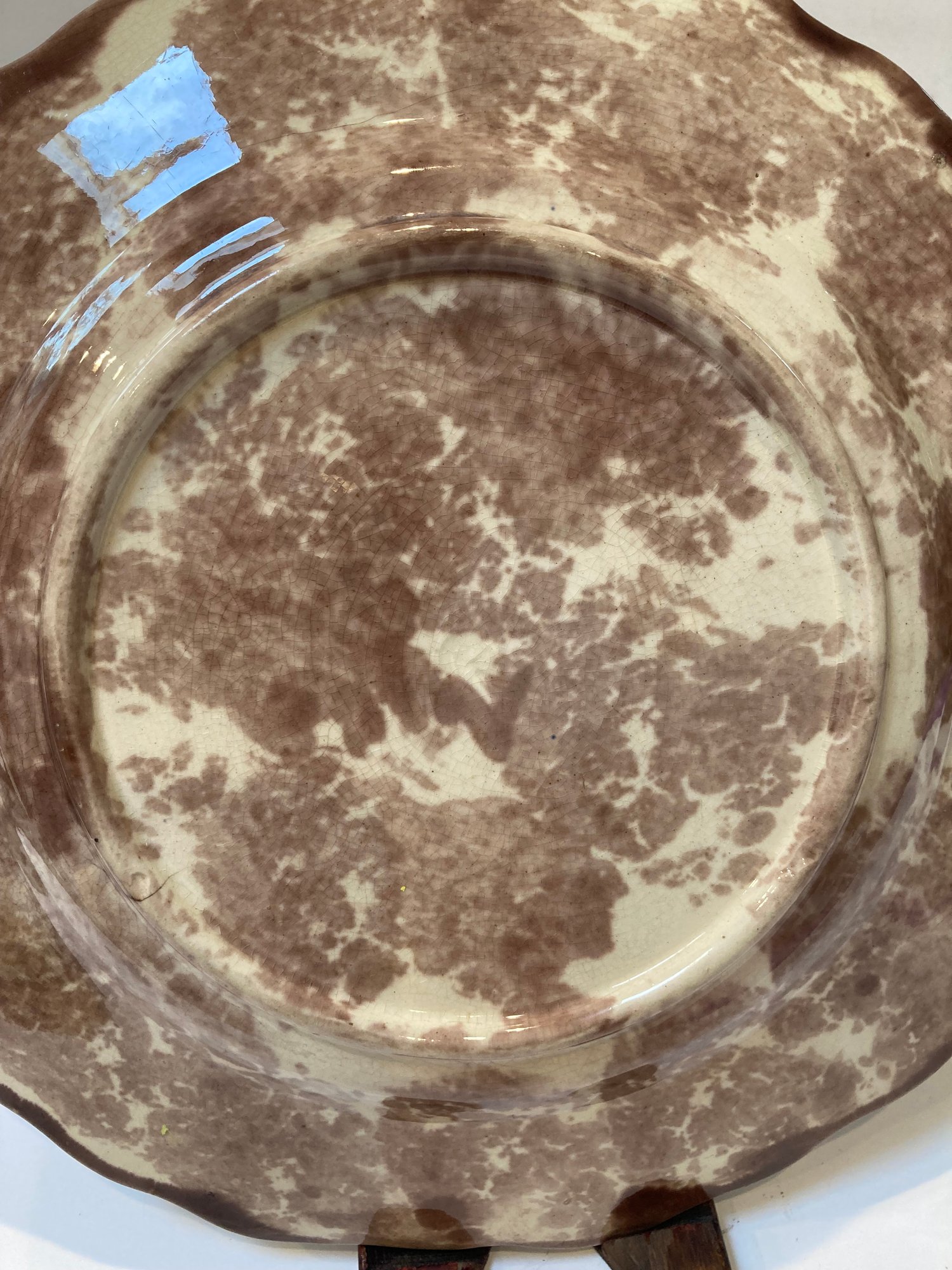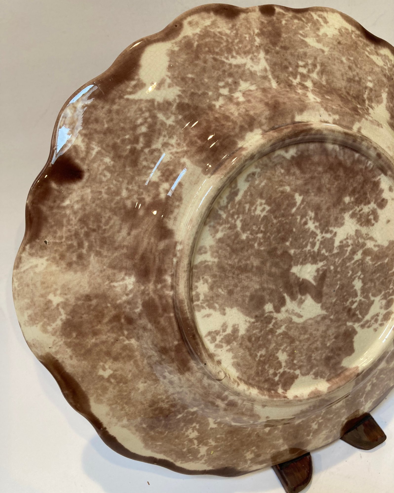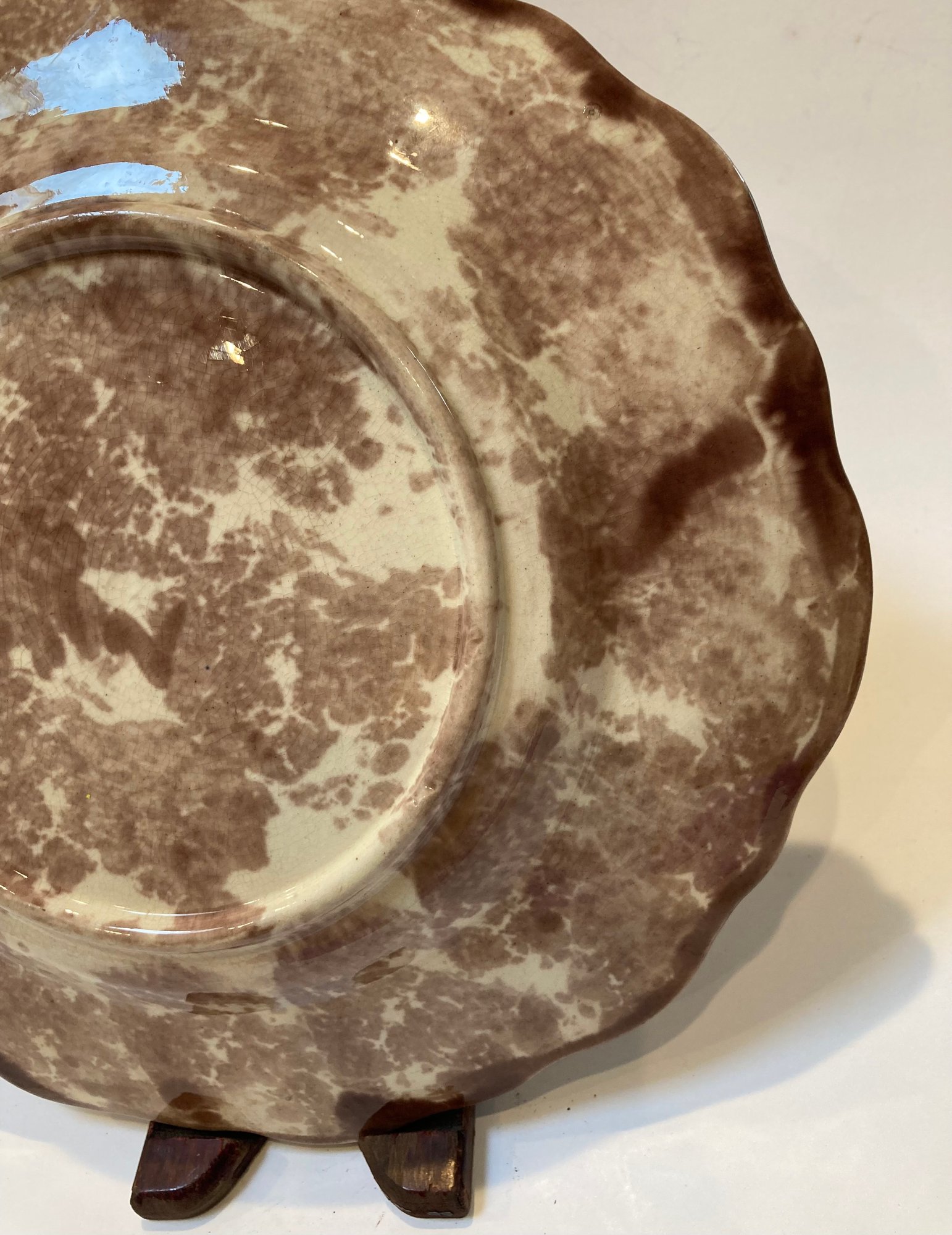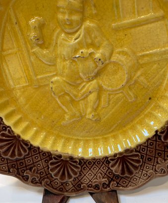 Heavy majolica plate by Villeroy & Boch showing an innkeeper serving beer from a barrel. The plate measures 11” in diameter. There are no chips or cracks, some loss of glaze from the innkeeper and some crazing consistent with age. There is a wide brown border of shells and fleur de lis. The estimated date of manufacture is 1880.