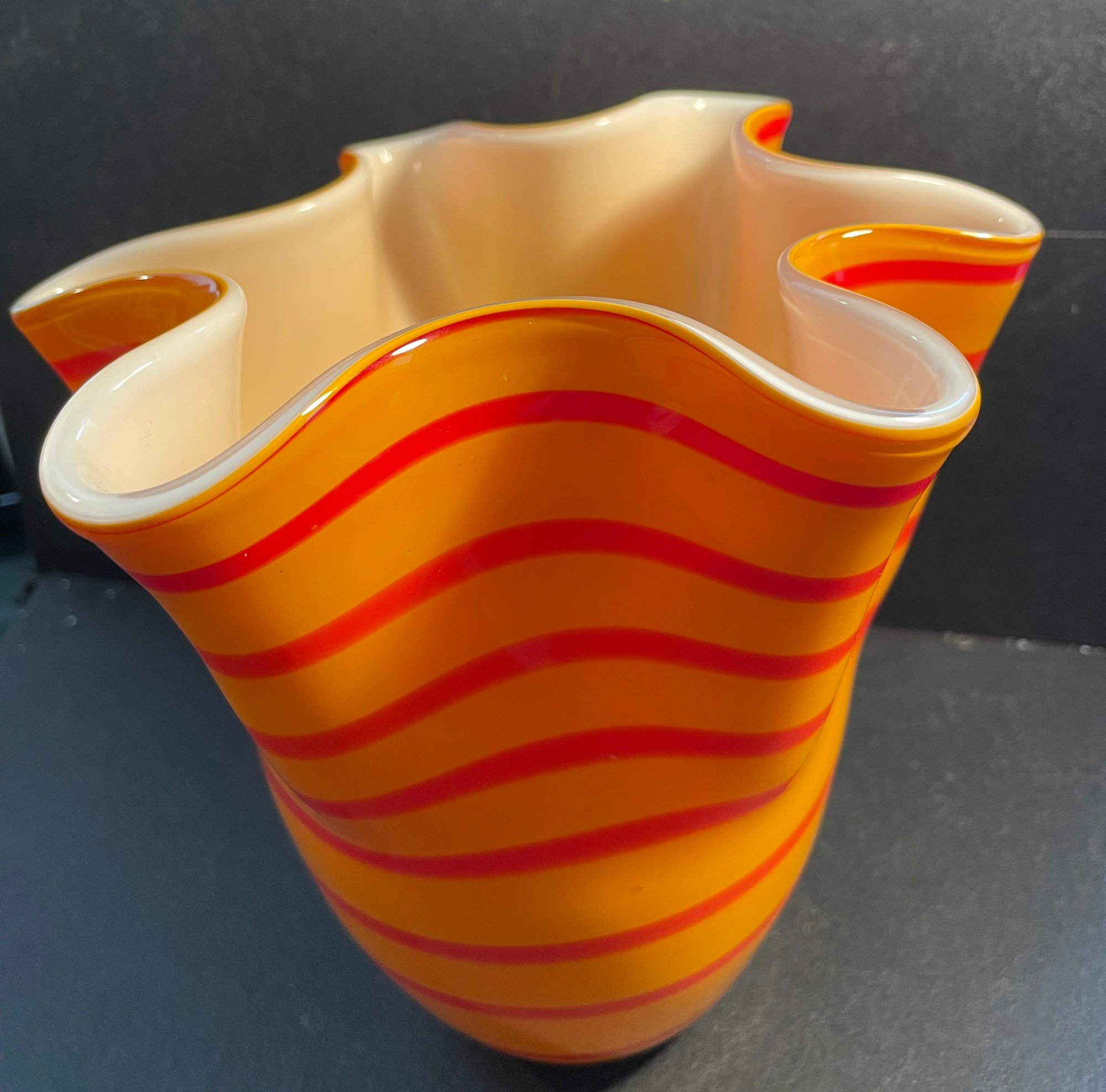 Vintage BOHO Blown Glass Orange Striped Vase - 7". Bold statement piece or floral display.