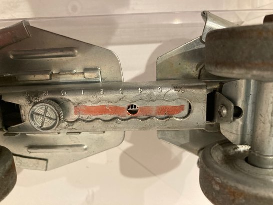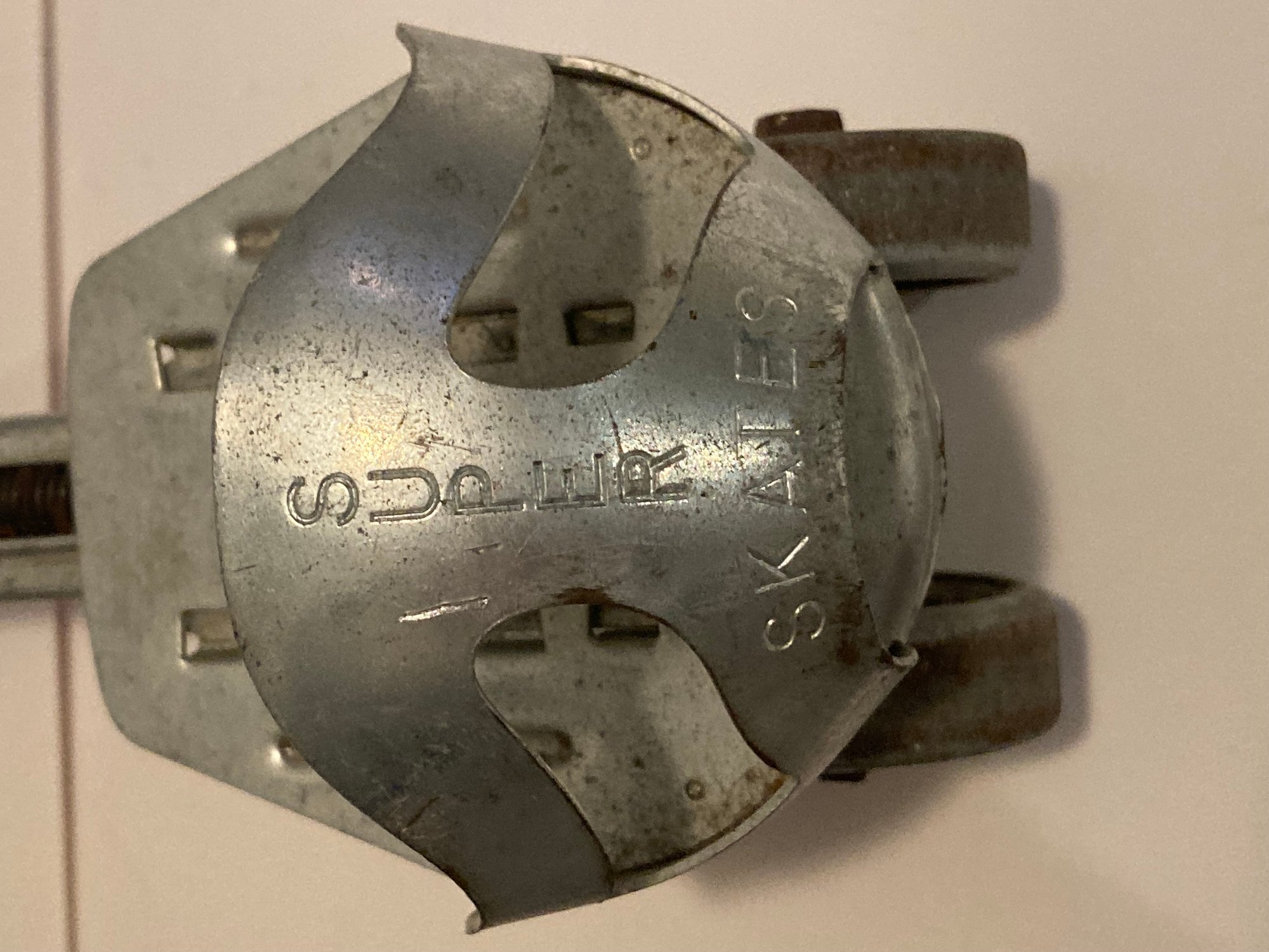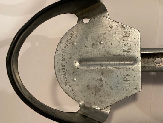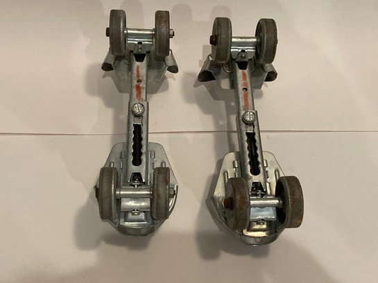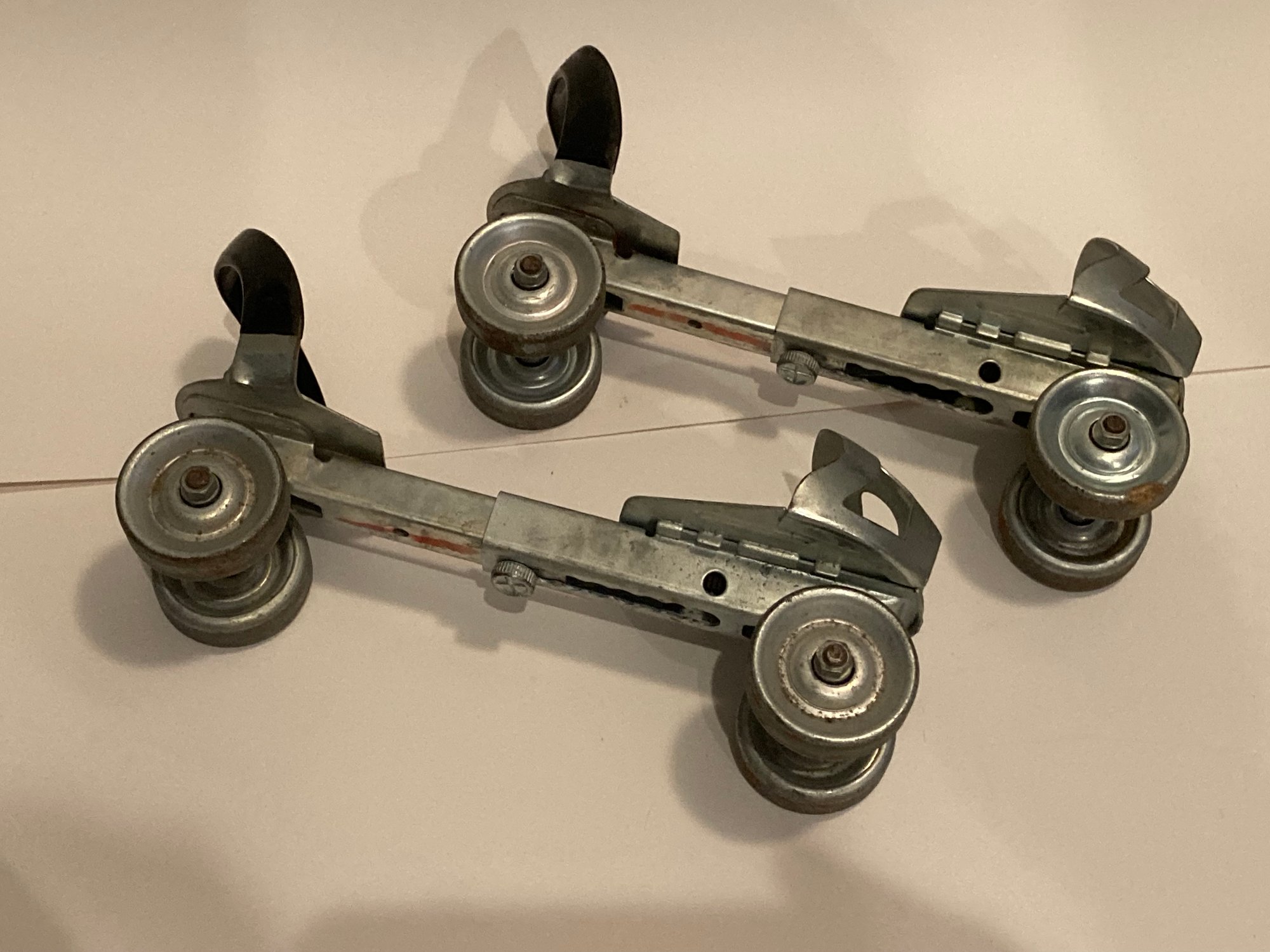 Vintage Super Skates with metal wheels sized for children’s feet. The length is adjustable, no key required. Probably date from the 1960’s. Smooth wheel action.