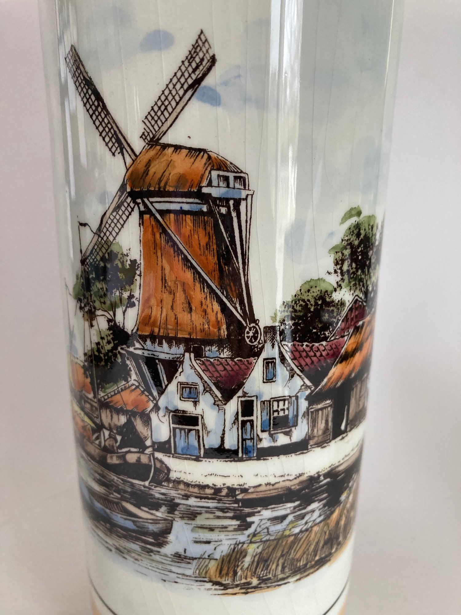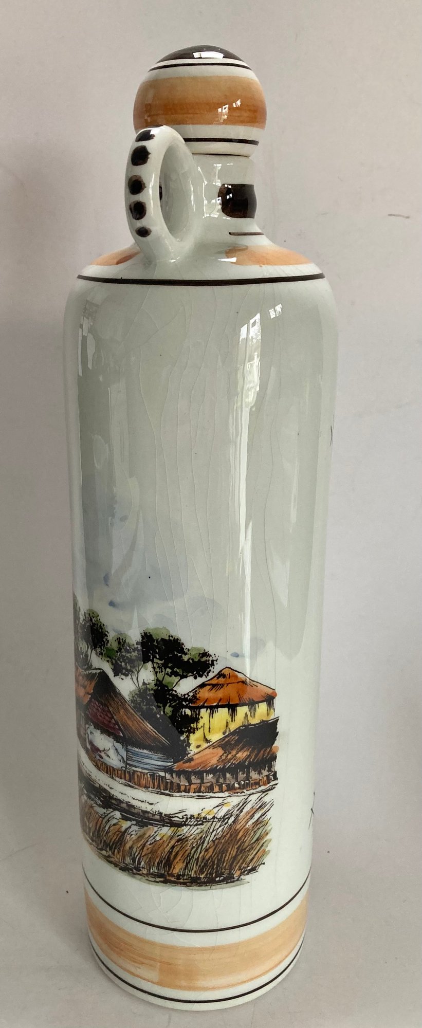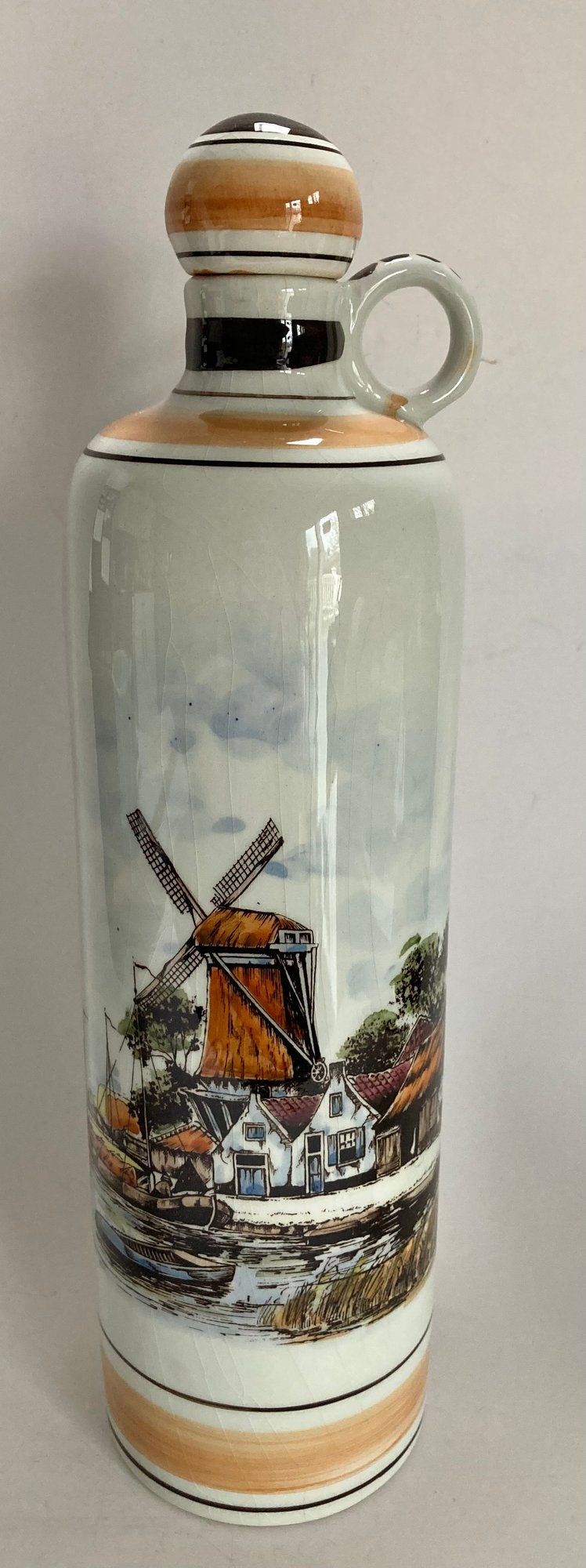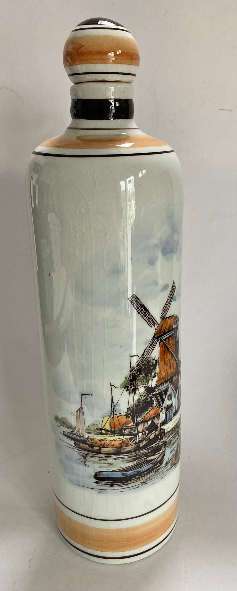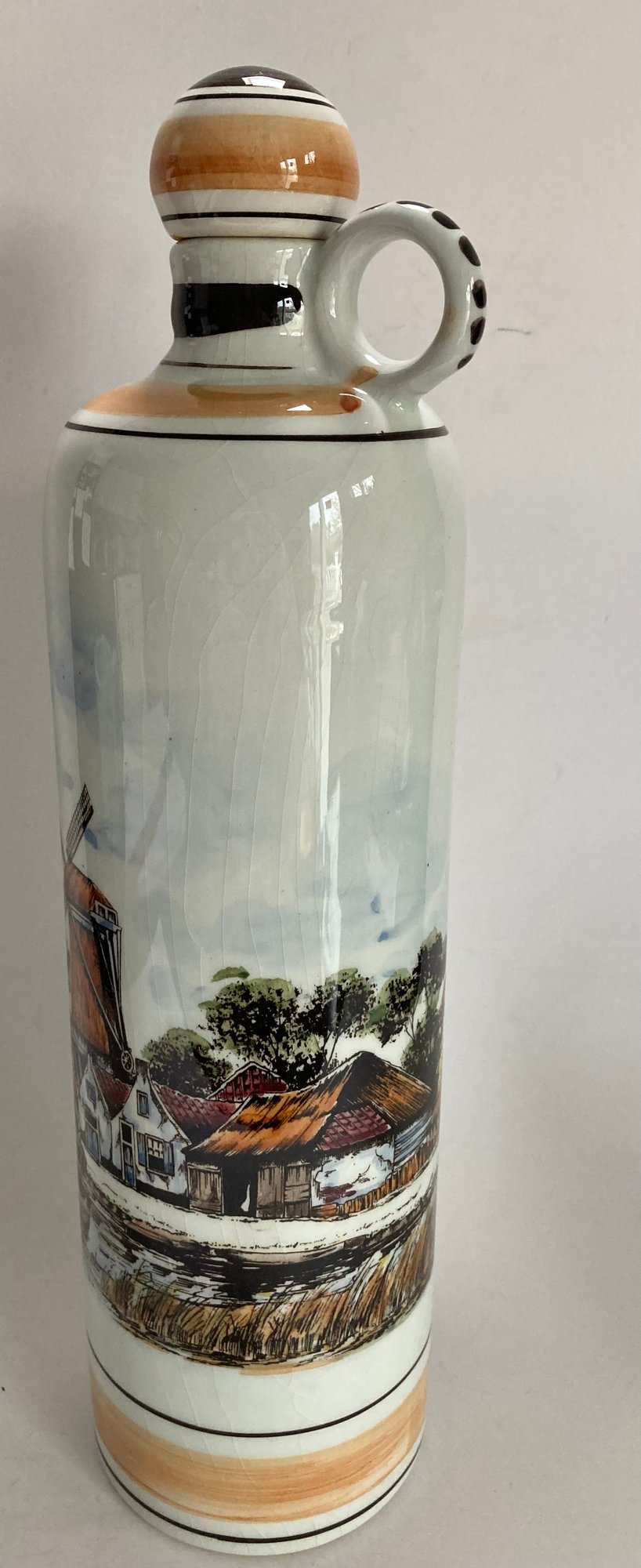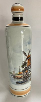 Delft decanter stands 12” high and depicts a river scene with boats, a windmill and houses. It is hand painted in shades of brown, blue and yellow. No chips or cracks but has some crazing. It is stamped Polychrome, hand painted and Holland on the bottom.