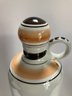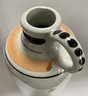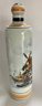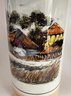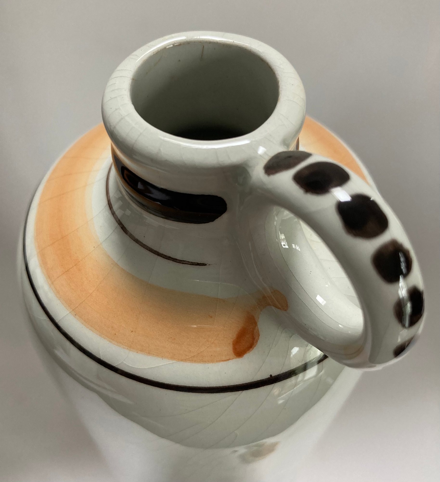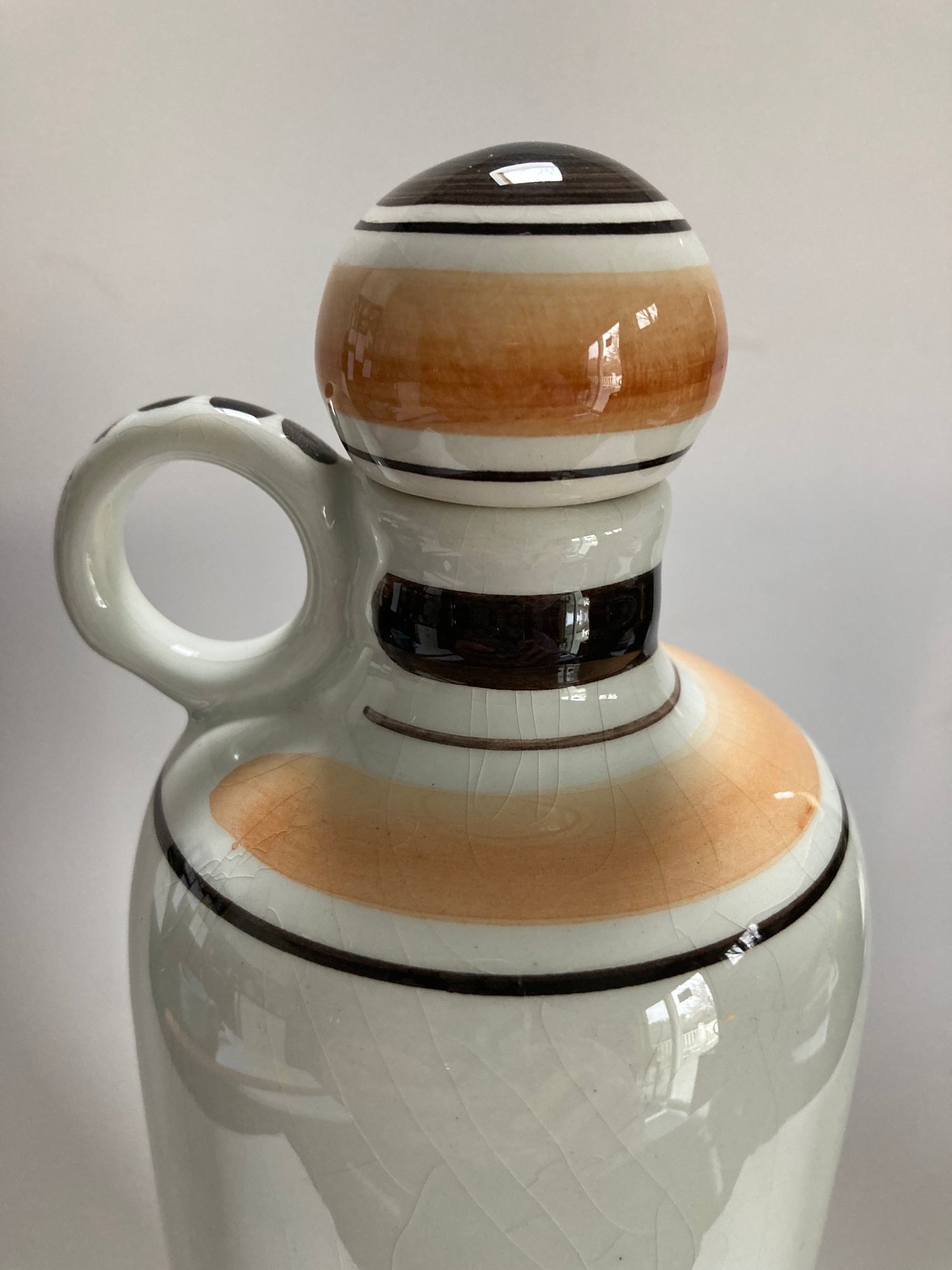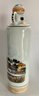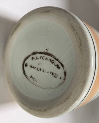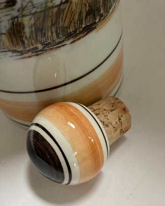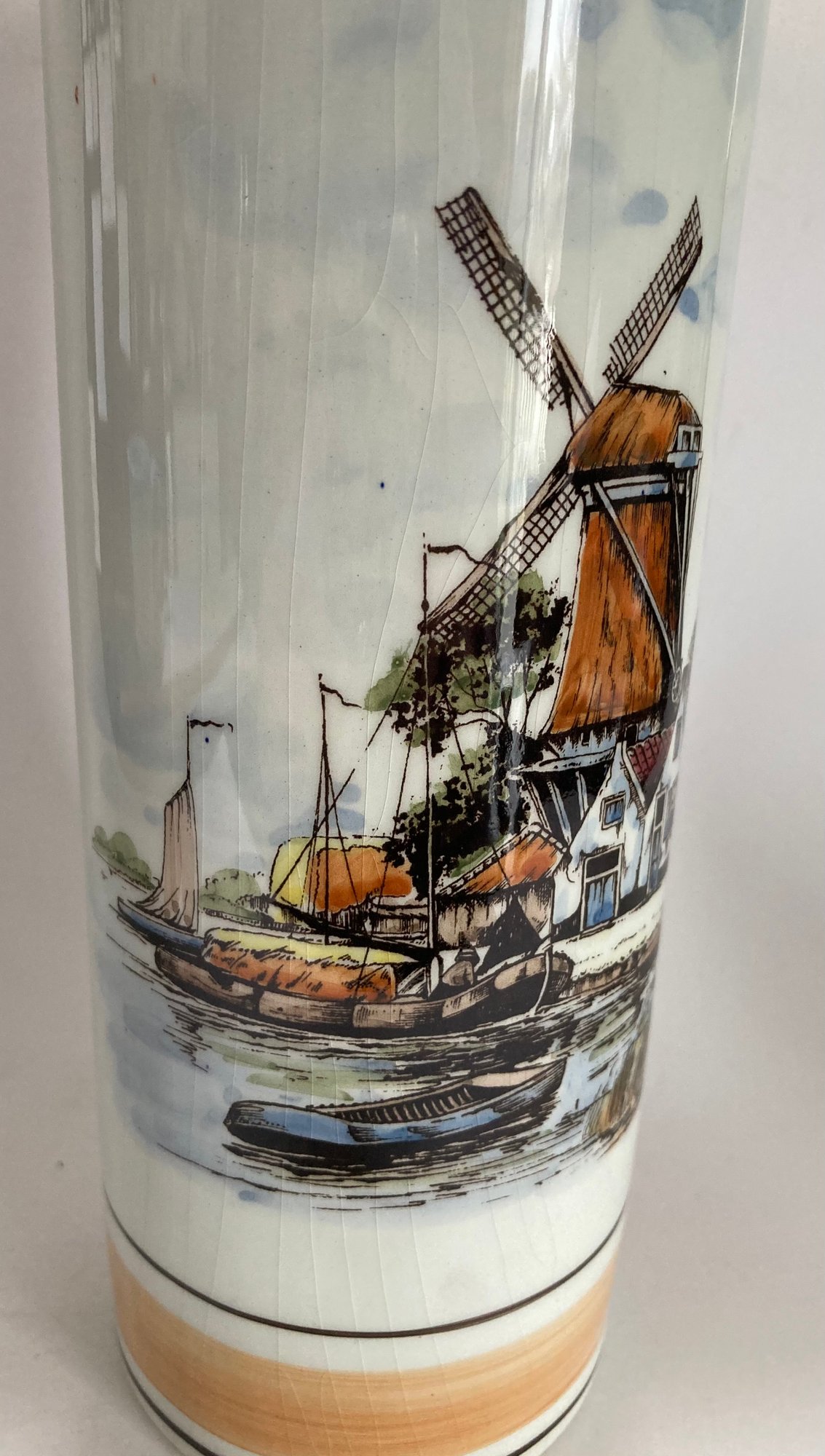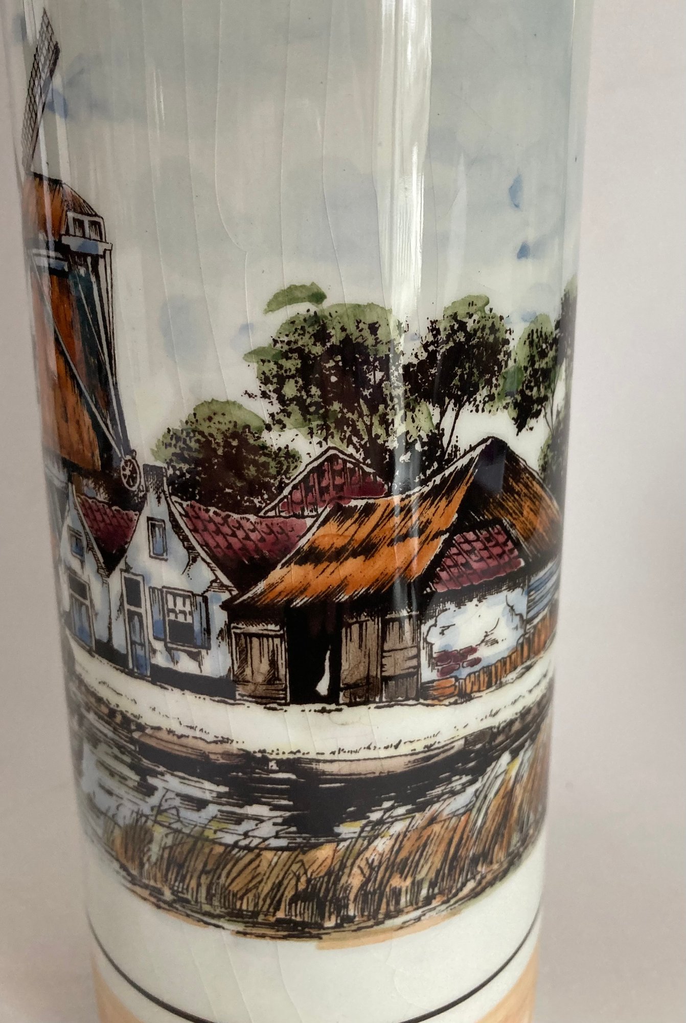 Delft decanter stands 12” high and depicts a river scene with boats, a windmill and houses. It is hand painted in shades of brown, blue and yellow. No chips or cracks but has some crazing. It is stamped Polychrome, hand painted and Holland on the bottom.