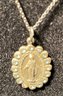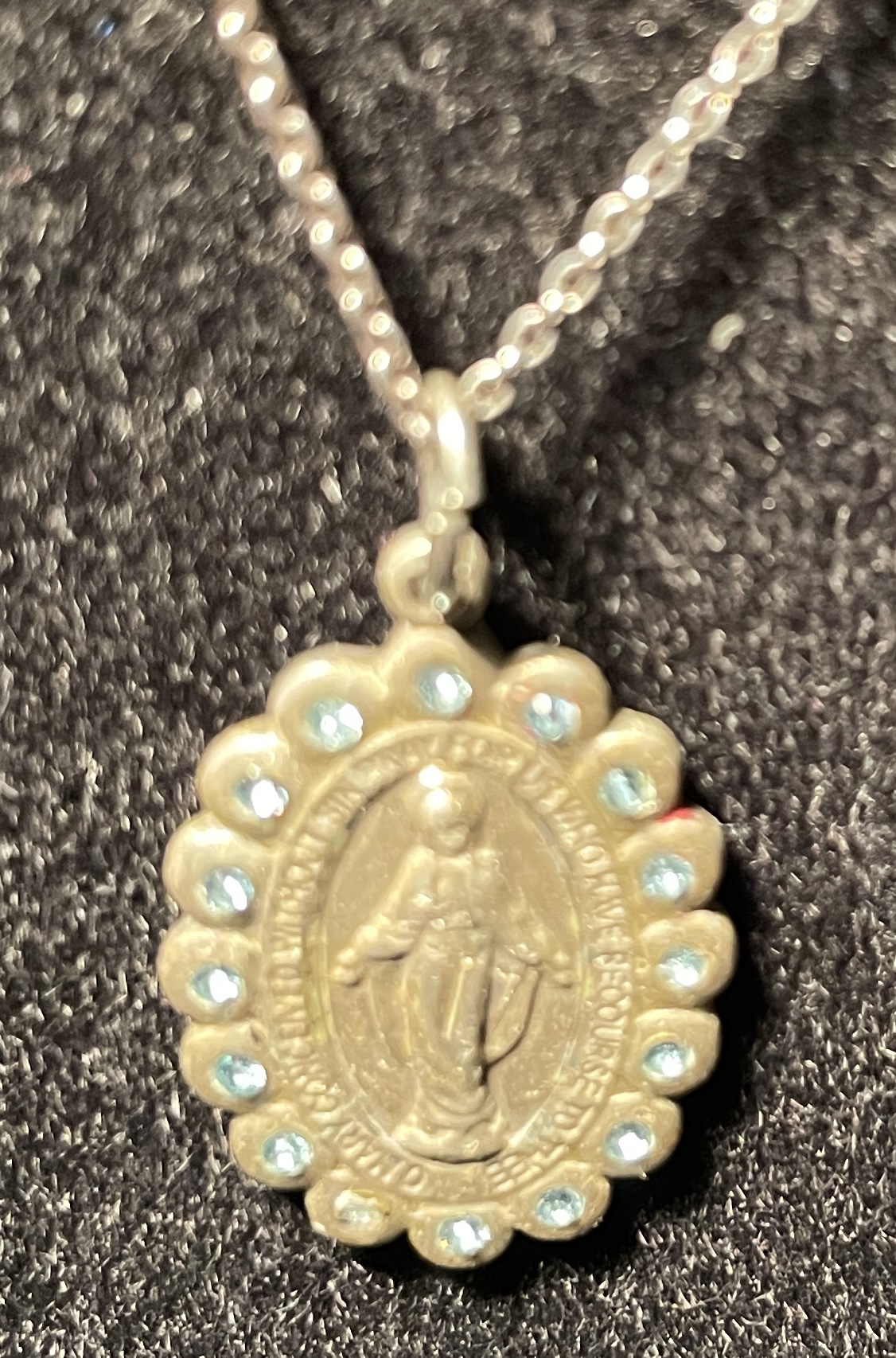Vintage Immaculate Conception STERLING BLISS Pendant (7/8x1/2") on Sterling Necklace 19". Aqua stones as pictured. Sold as-is, as-found.