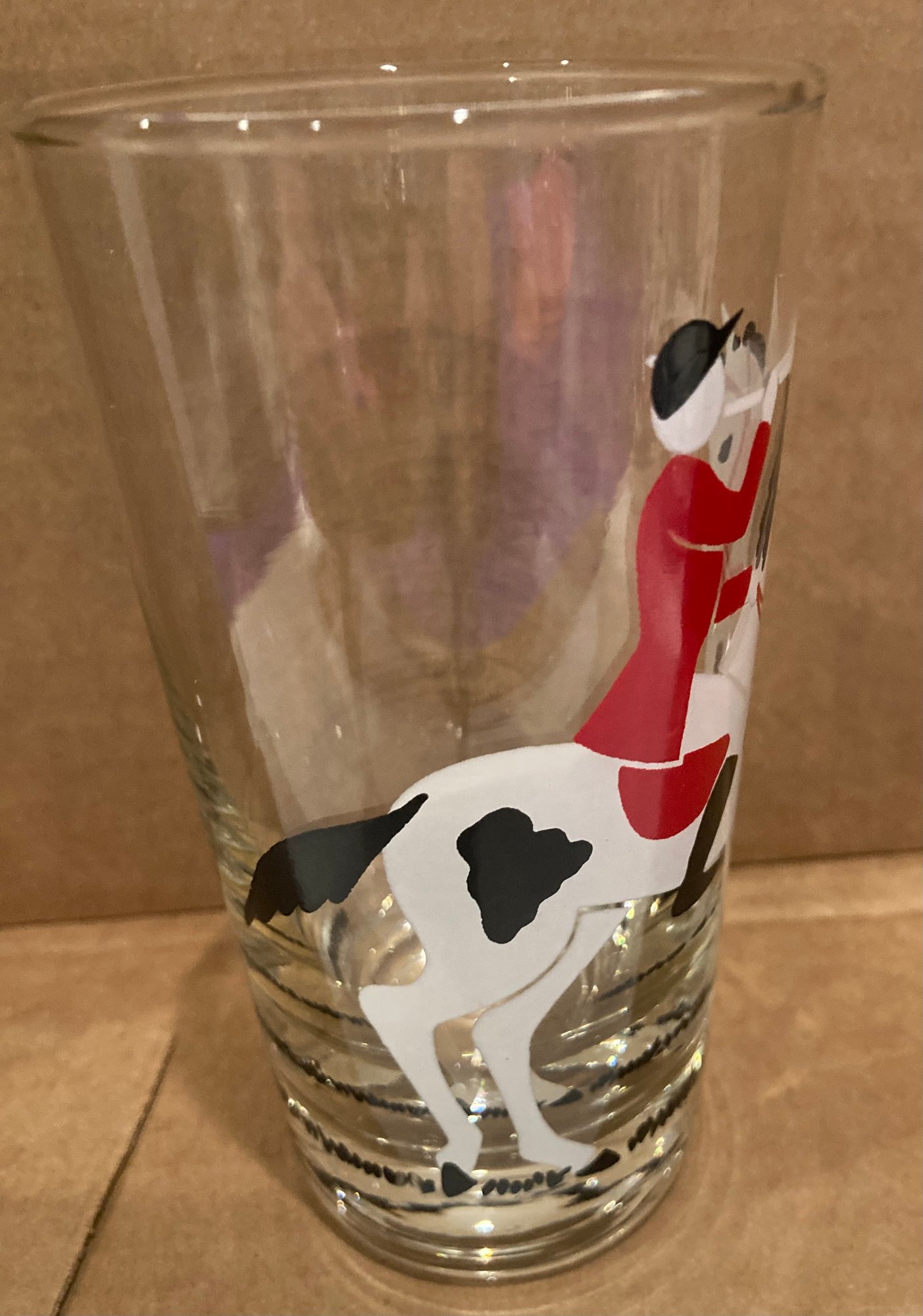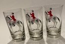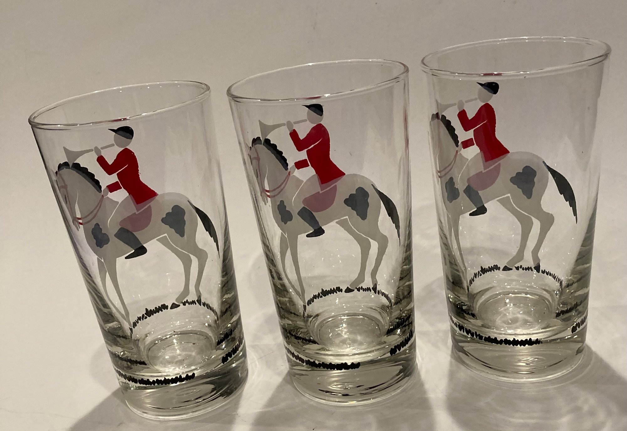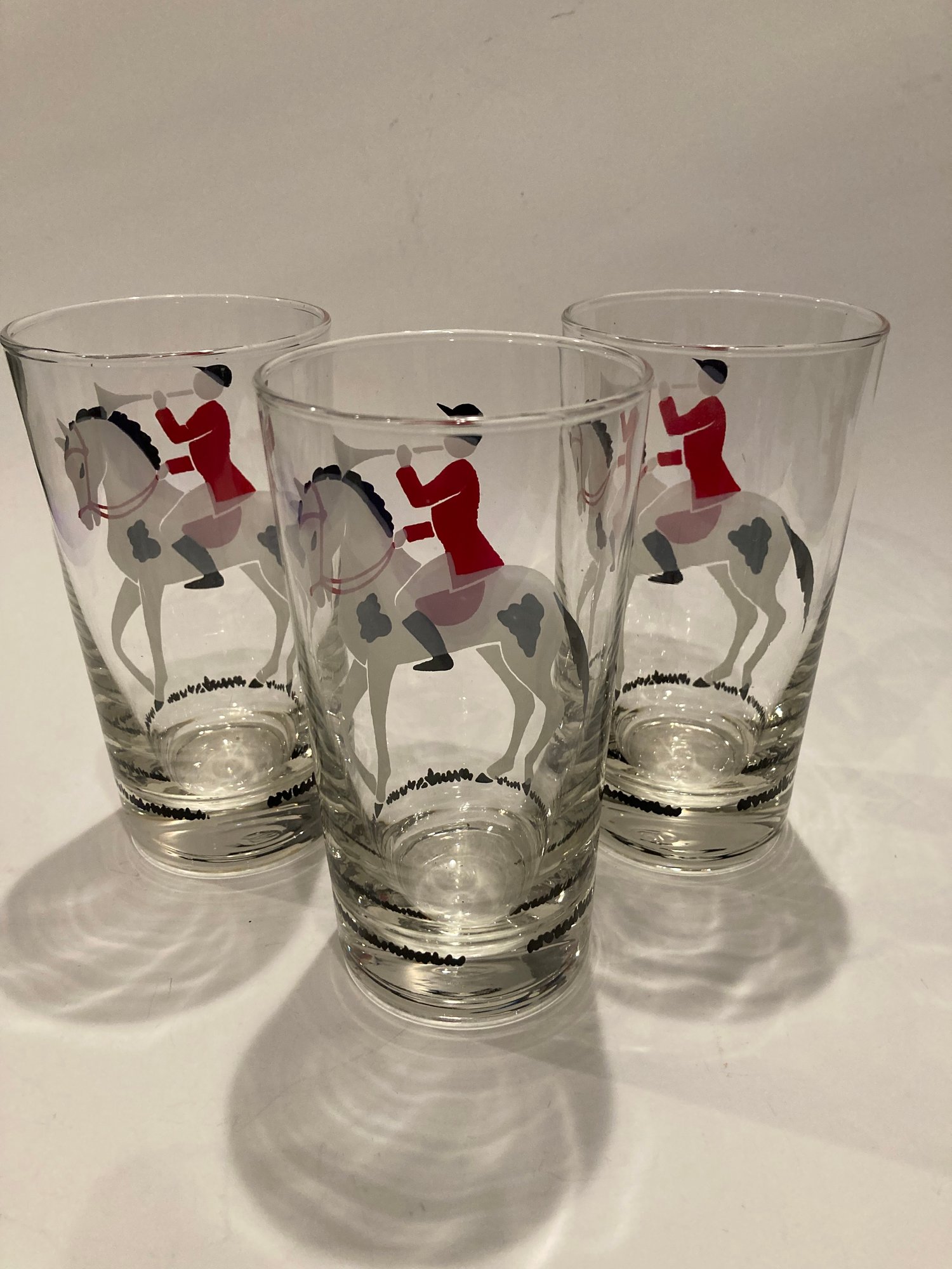 Set of 3 Libbey “Talley Ho” fox hunting equestrian highball glasses. Glasses are in excellent condition. They are 5 1/4” tall and show a rider in traditional hunting attire, blowing a bugle, and mounted on a white horse.