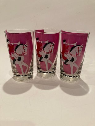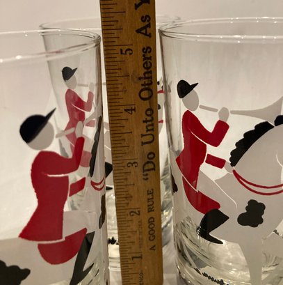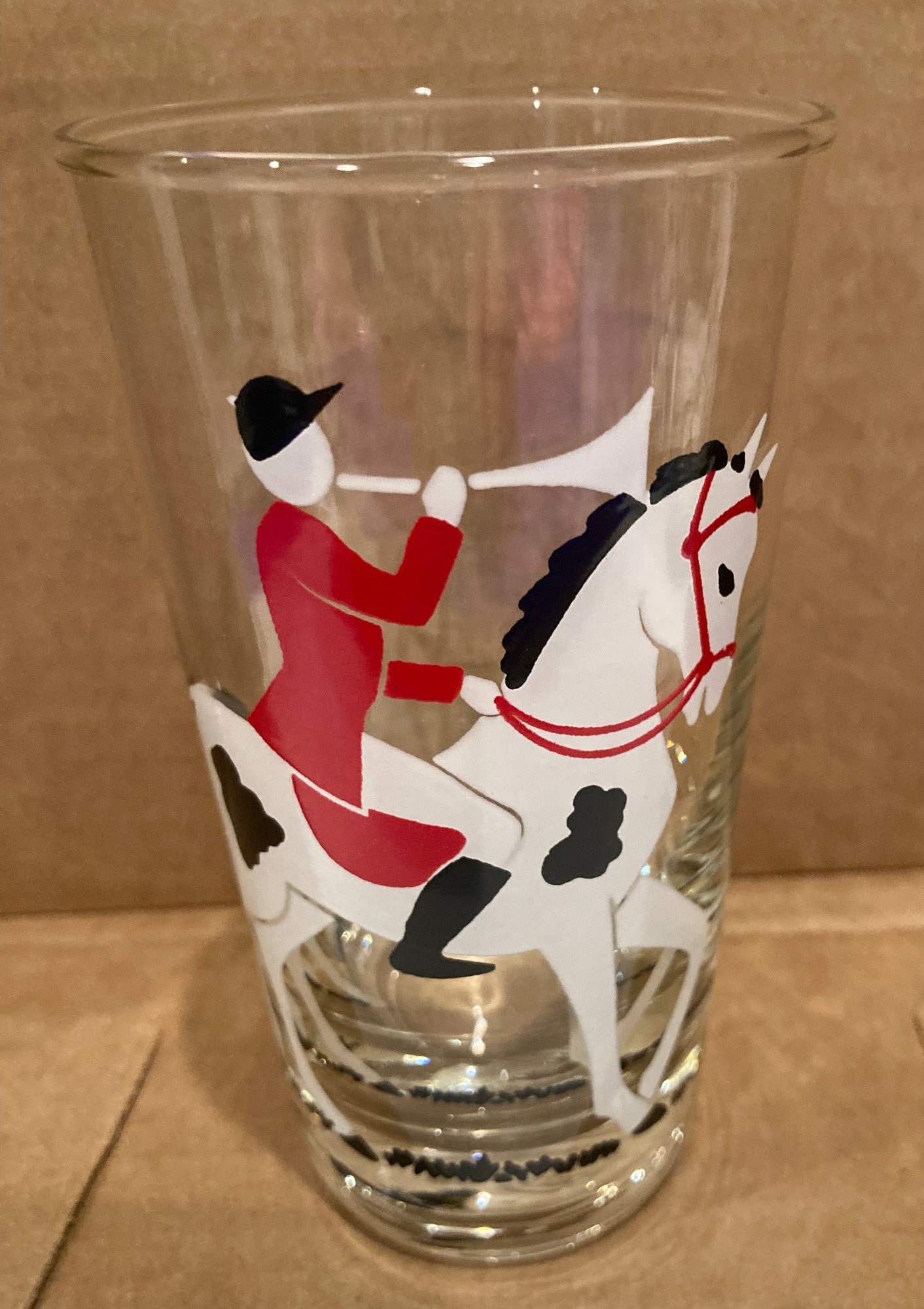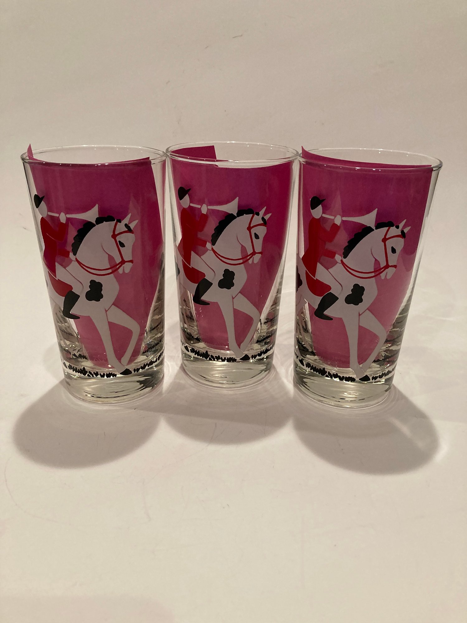 Set of 3 Libbey “Talley Ho” fox hunting equestrian highball glasses. Glasses are in excellent condition. They are 5 1/4” tall and show a rider in traditional hunting attire, blowing a bugle, and mounted on a white horse.