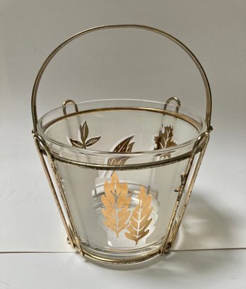 Beautiful Midcentury Modern Ice Bucket by G. Reeves. Bucket depicts gold leaves on a frosted background. There are no chips or cracks, the gold is in good condition. The gold tone holder has some rust consistent with age.