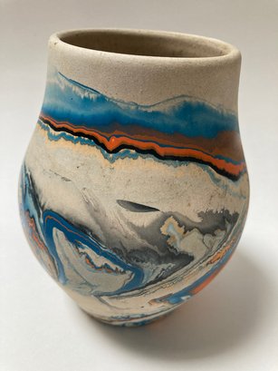 Beautiful blue/orange/gray vase made by Nemadji Pottery. The company started in 1923 in Minnesota and produced wares for the tourist trade until 1972. This vase dates from the 1950’s. Wares were inspired by, not made by, American Indians. The vase is 5 1/2” tall. There are no cracks or chips but appears to have some white paint on the rim.