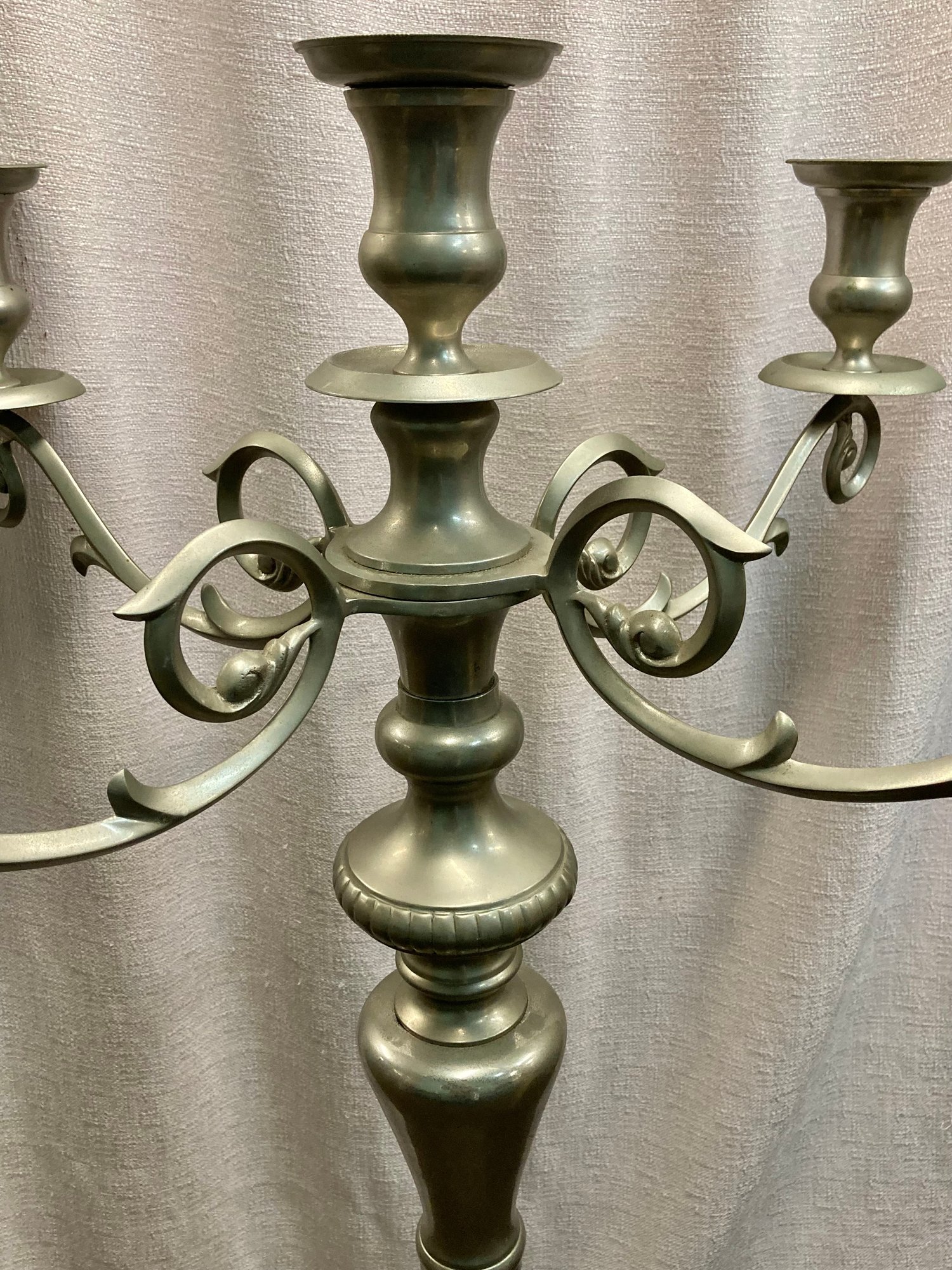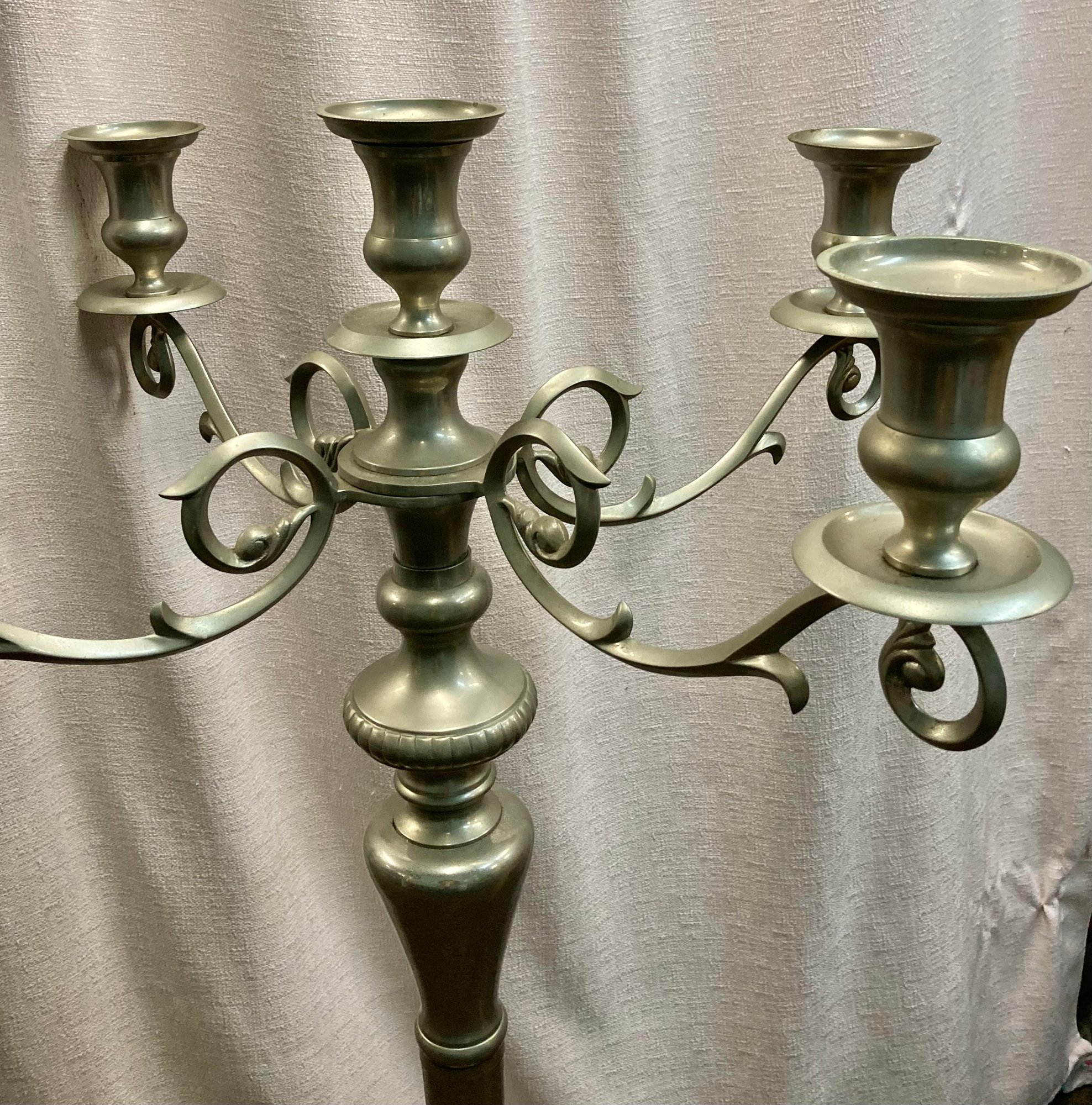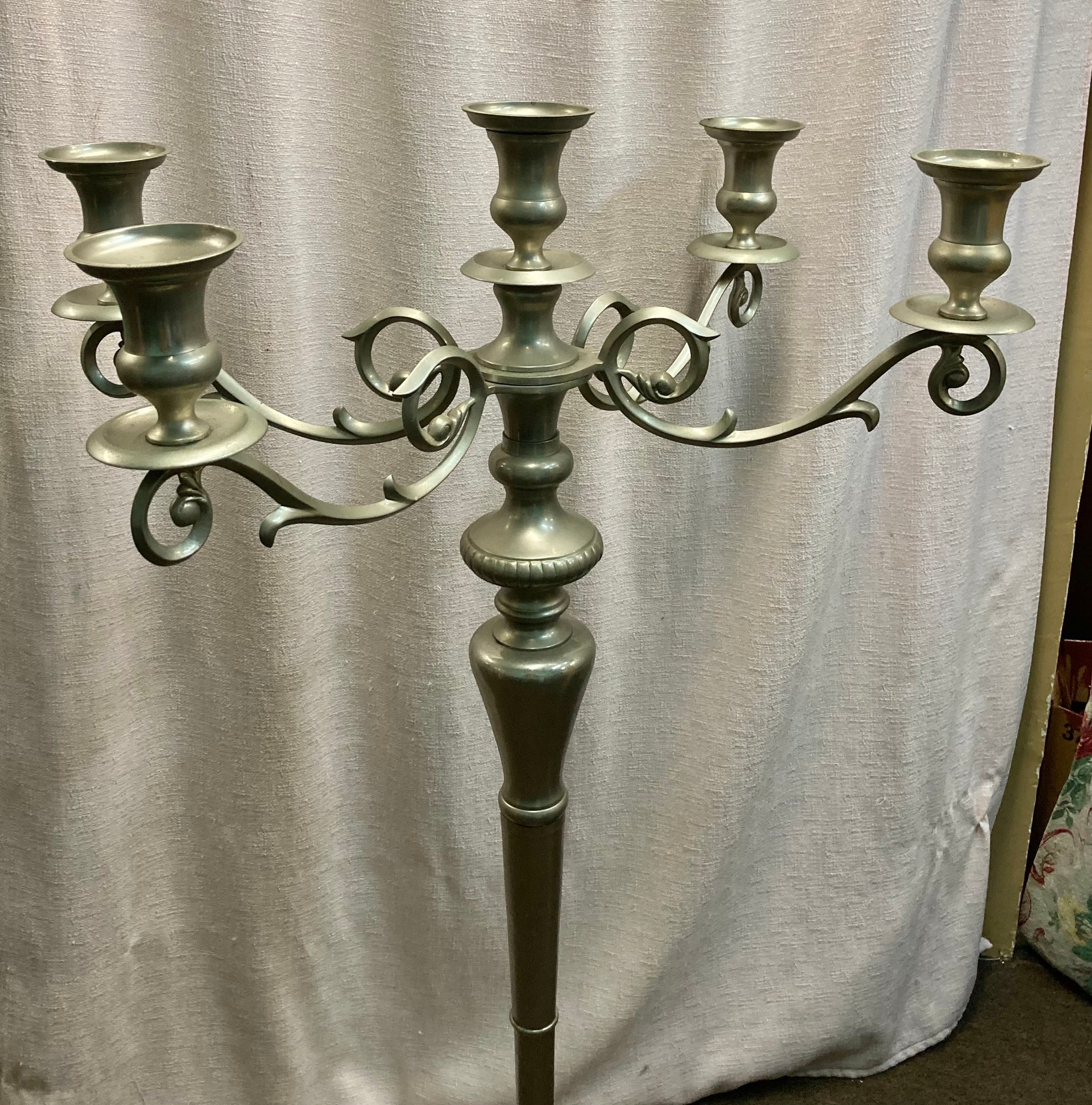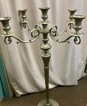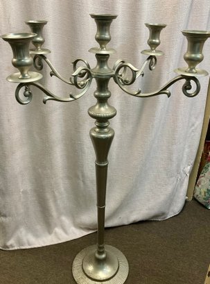 Beautiful candelabra in silver tone metal stands 49” high and has a width of 29”. The arms are movable and can be folded in to place it closer to a wall. Candelabra has five arms in which to place your pillar candeles. There is some rust on the base. This is definitely a statement piece for your home or office.