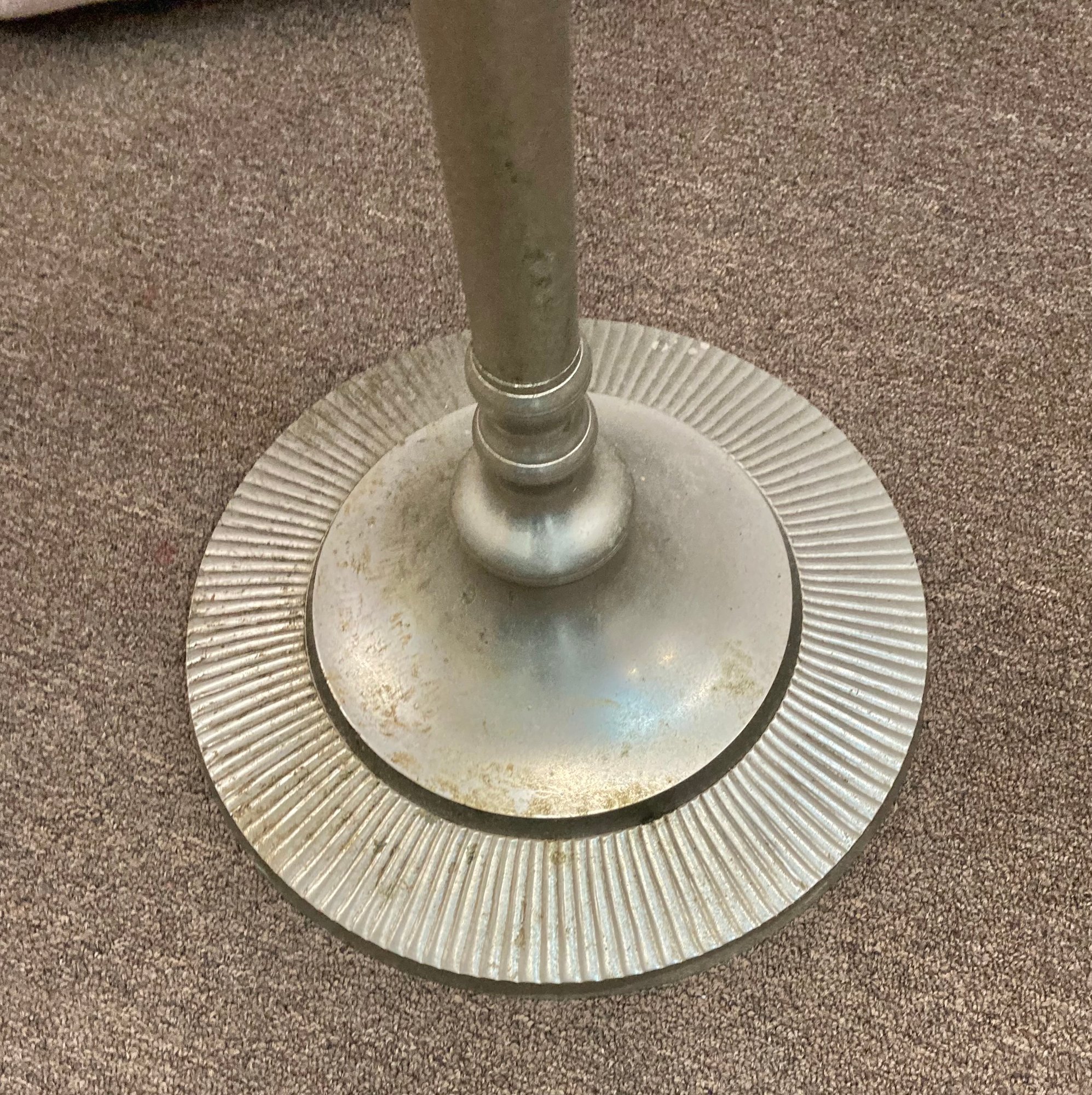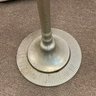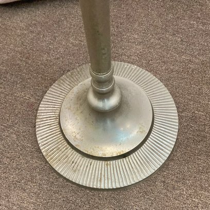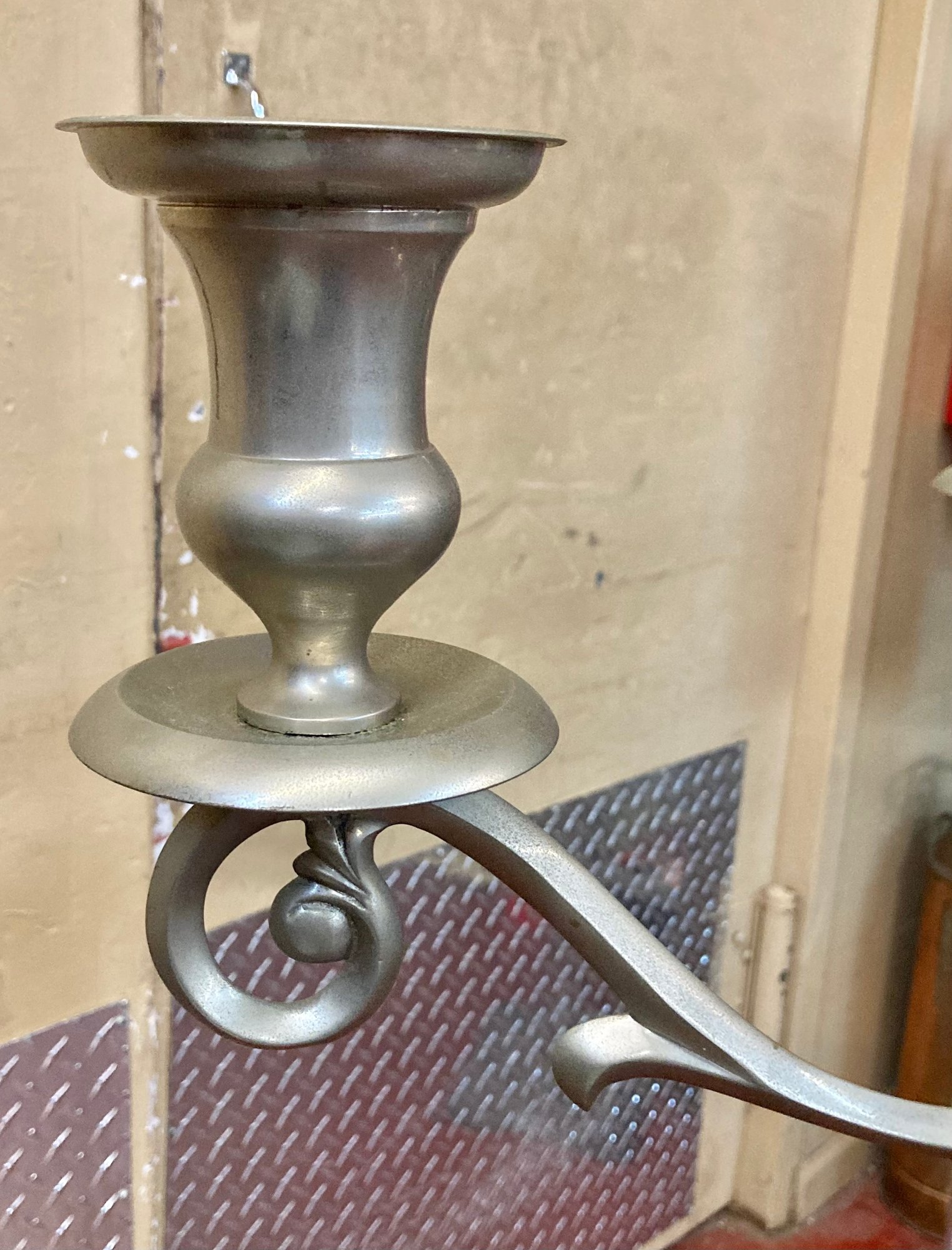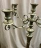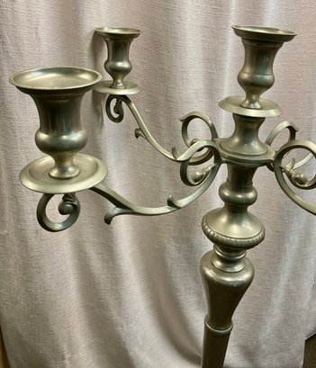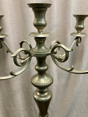 Beautiful candelabra in silver tone metal stands 49” high and has a width of 29”. The arms are movable and can be folded in to place it closer to a wall. Candelabra has five arms in which to place your pillar candeles. There is some rust on the base. This is definitely a statement piece for your home or office.
