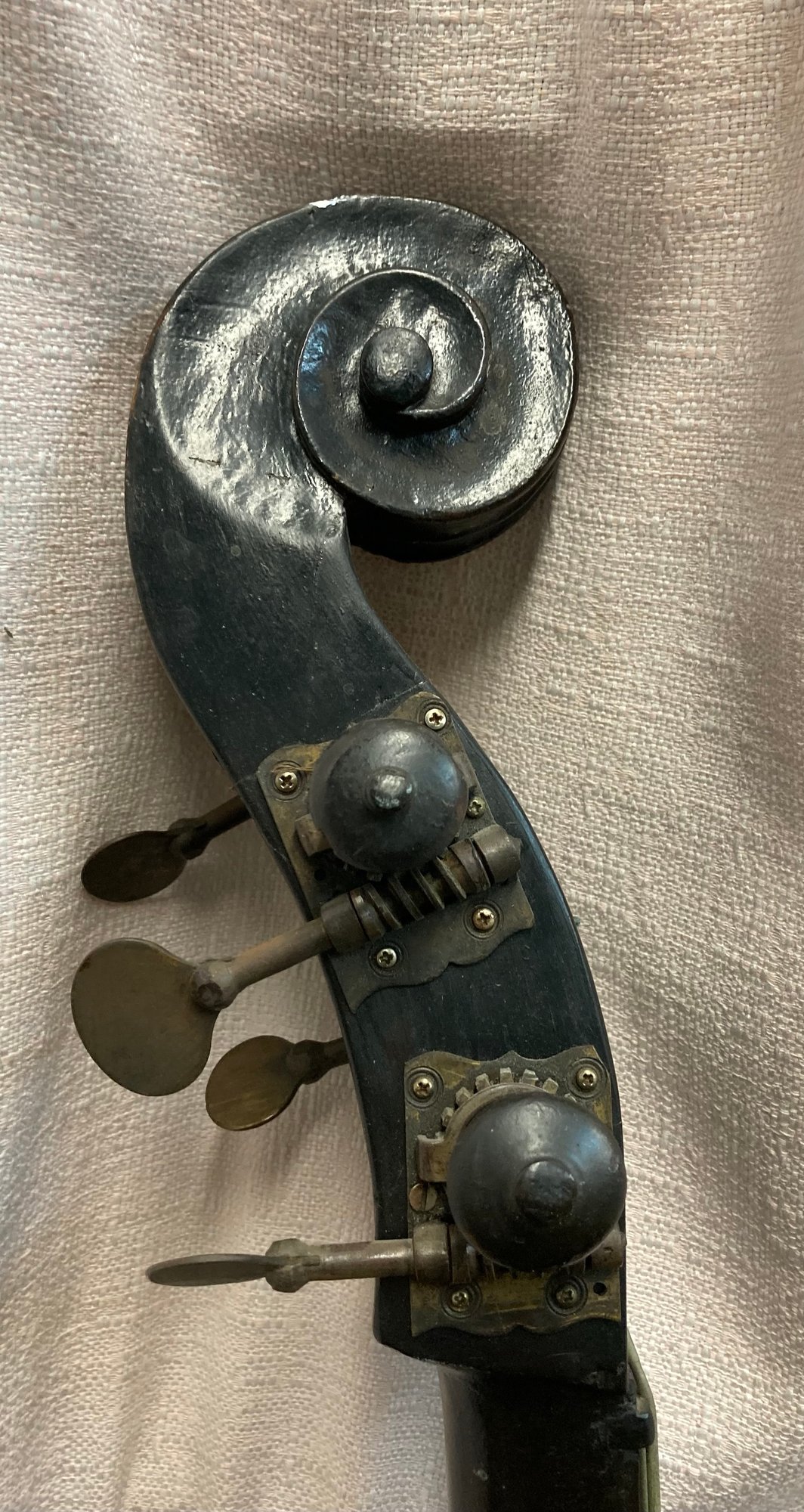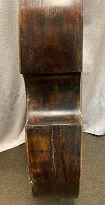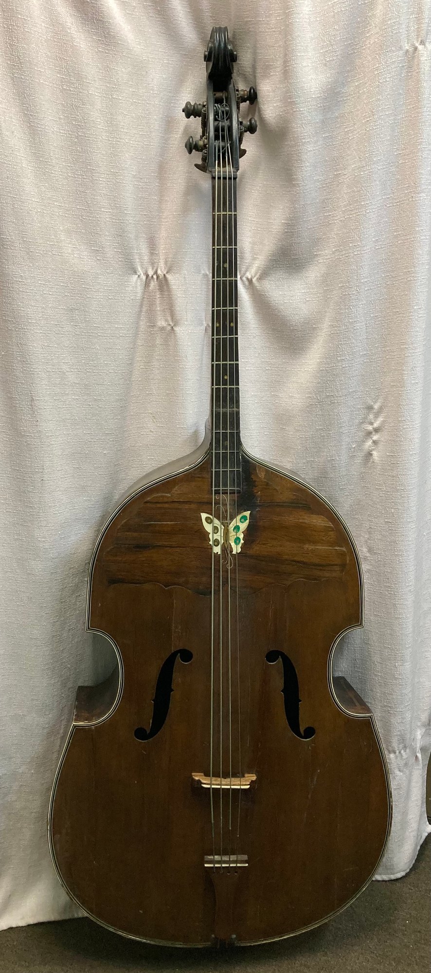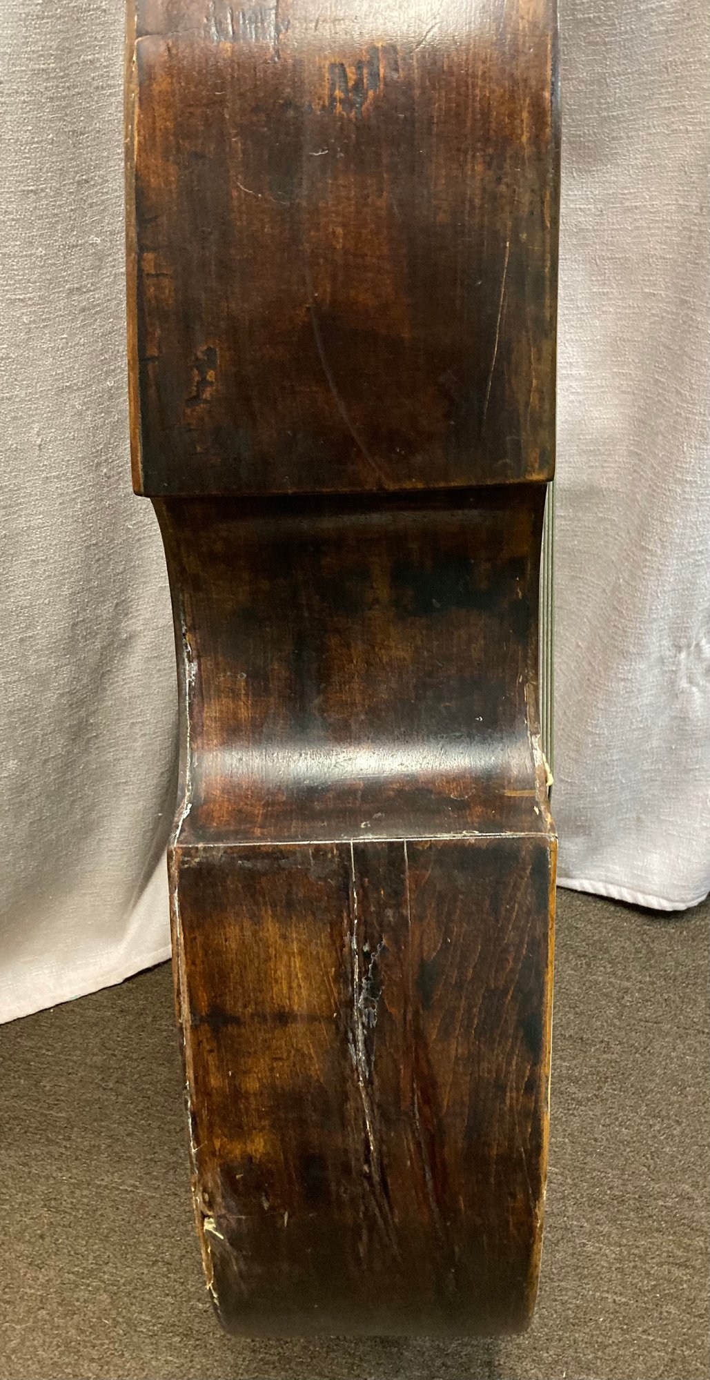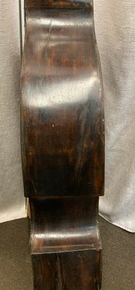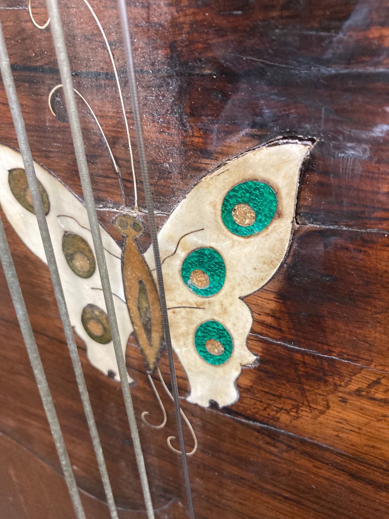 This impressive instrument has a beautiful patina and butterfly shaped inlay. It needs some restoration work but would be a lovely decorative piece. It stands 73” tall and 27” at it’s widest.