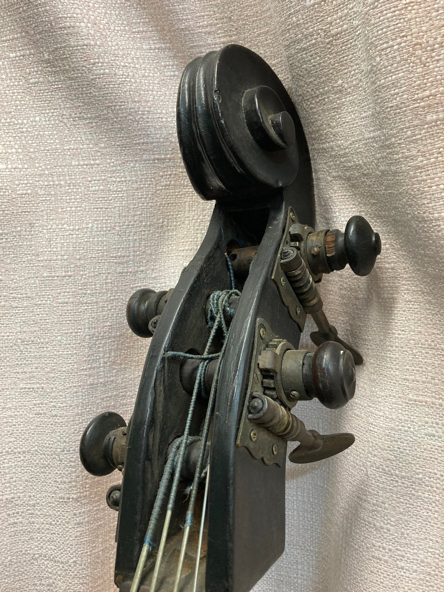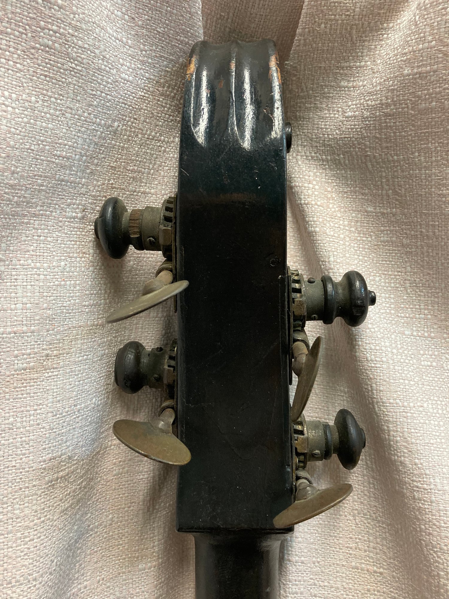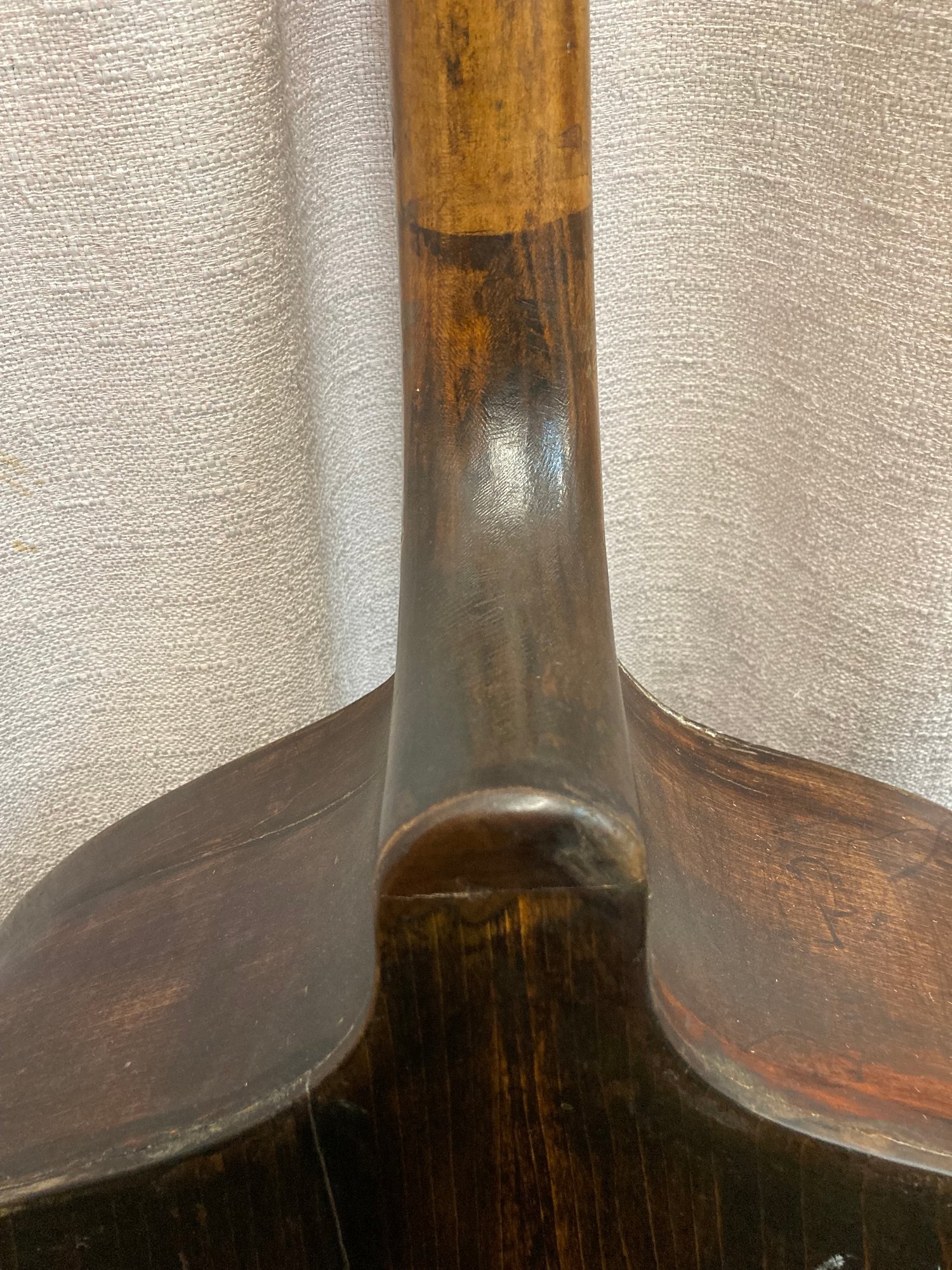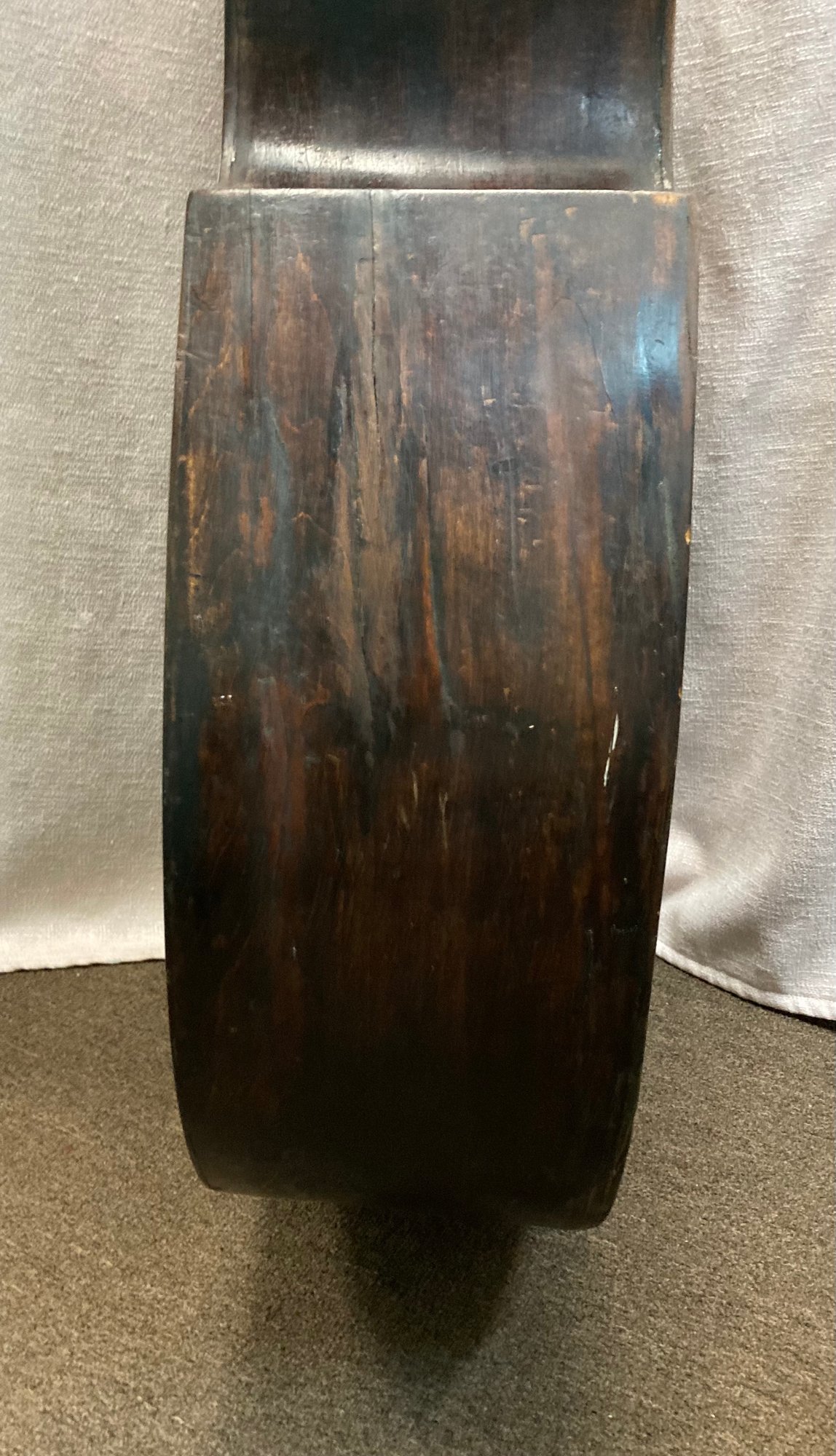 This impressive instrument has a beautiful patina and butterfly shaped inlay. It needs some restoration work but would be a lovely decorative piece. It stands 73” tall and 27” at it’s widest.