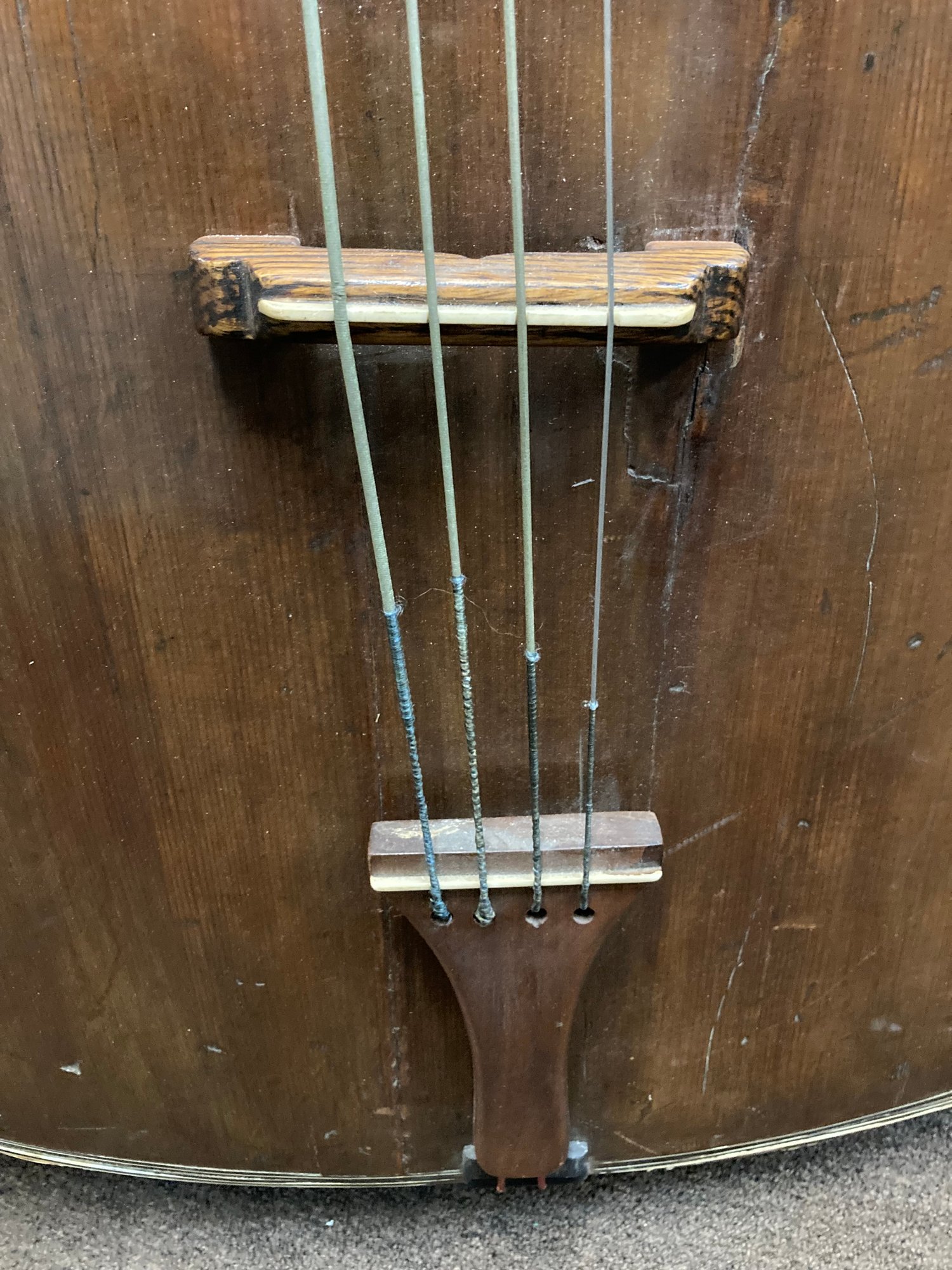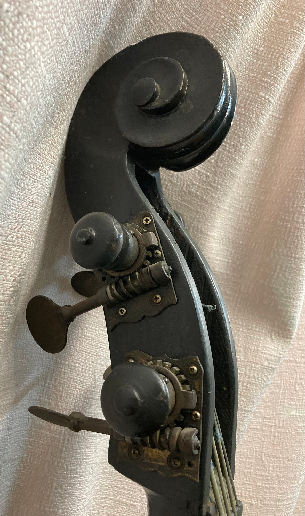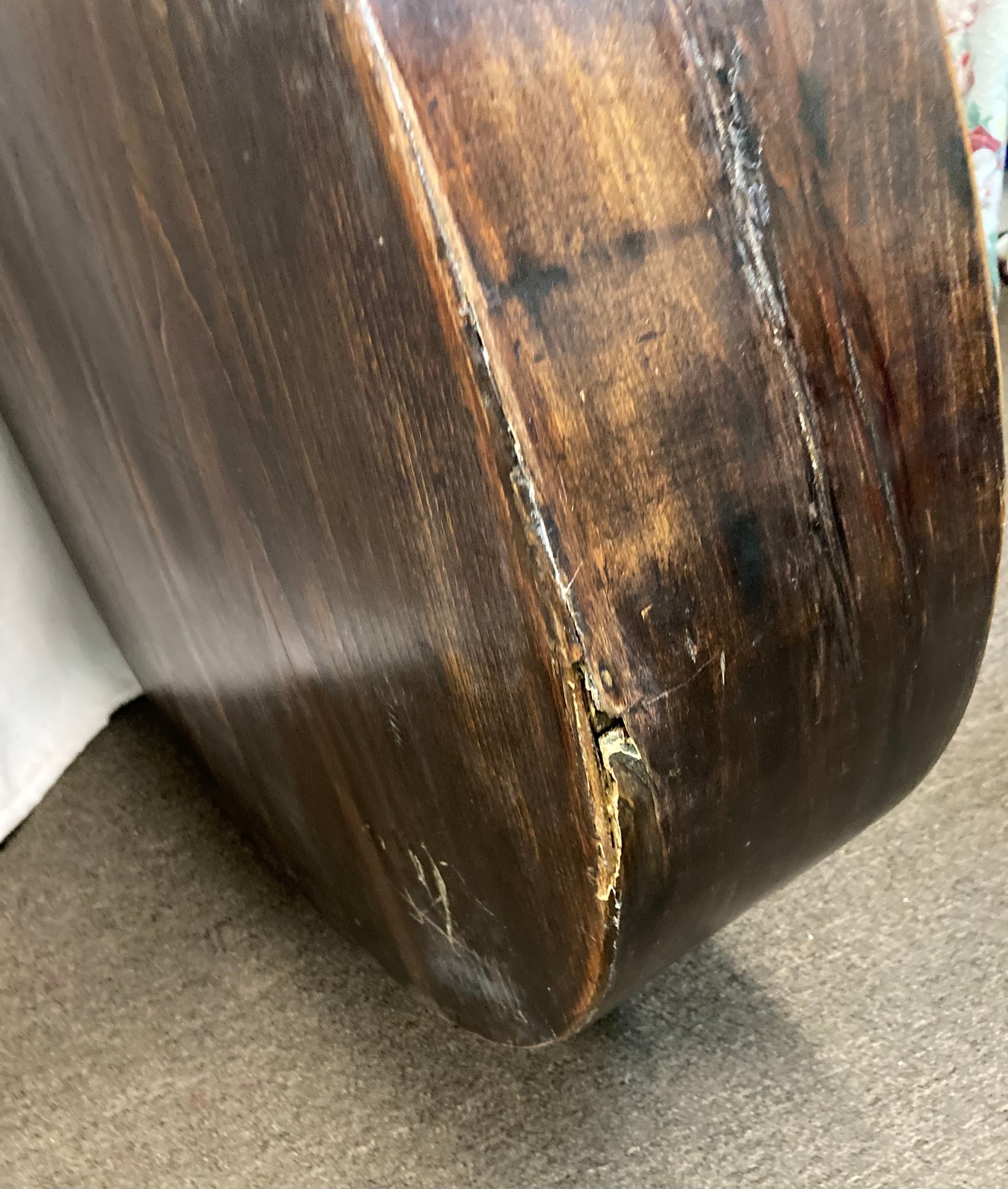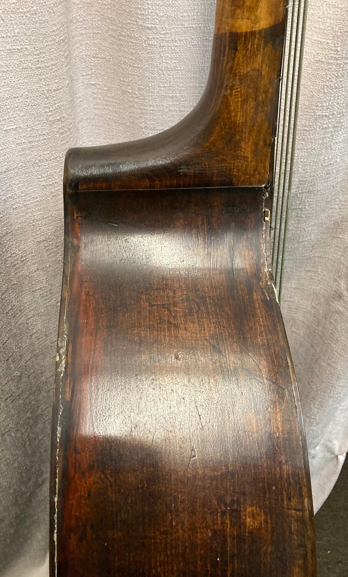 This impressive instrument has a beautiful patina and butterfly shaped inlay. It needs some restoration work but would be a lovely decorative piece. It stands 73” tall and 27” at it’s widest.
