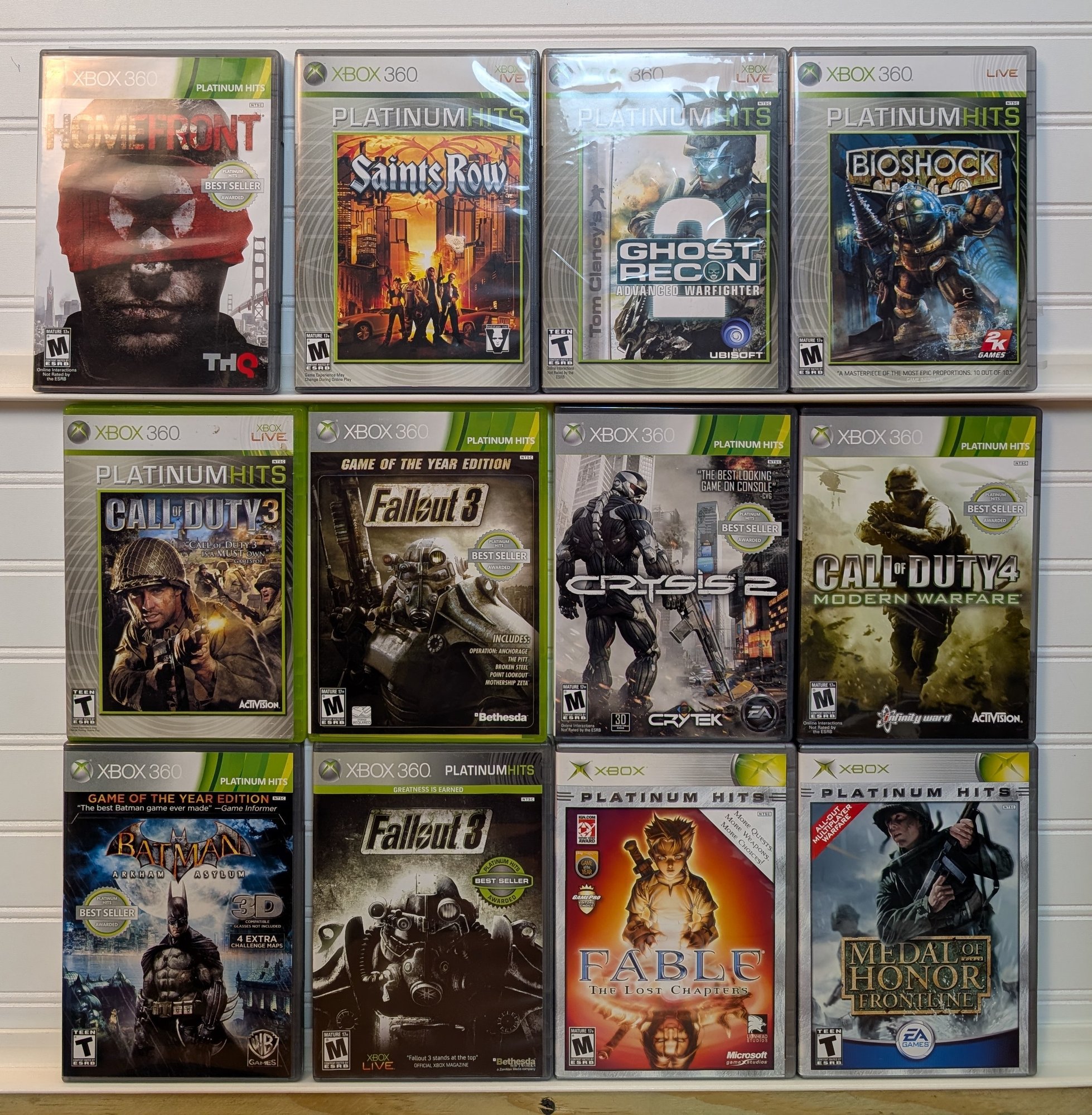Lot of 12 preowned Xbox 360 games, all in Platinum Hits or Game of the Year editions. Titles include Fallout 3 (two editions), Bioshock, Call of Duty 3, Call of Duty 4: Modern Warfare, Batman Arkham Asylum GOTY, Fable: The Lost Chapters, Medal of Honor: Frontline, Crysis 2, Tom Clancy’s Ghost Recon Advanced Warfighter 2, Homefront, and Saints Row. All titles come in original cases.
