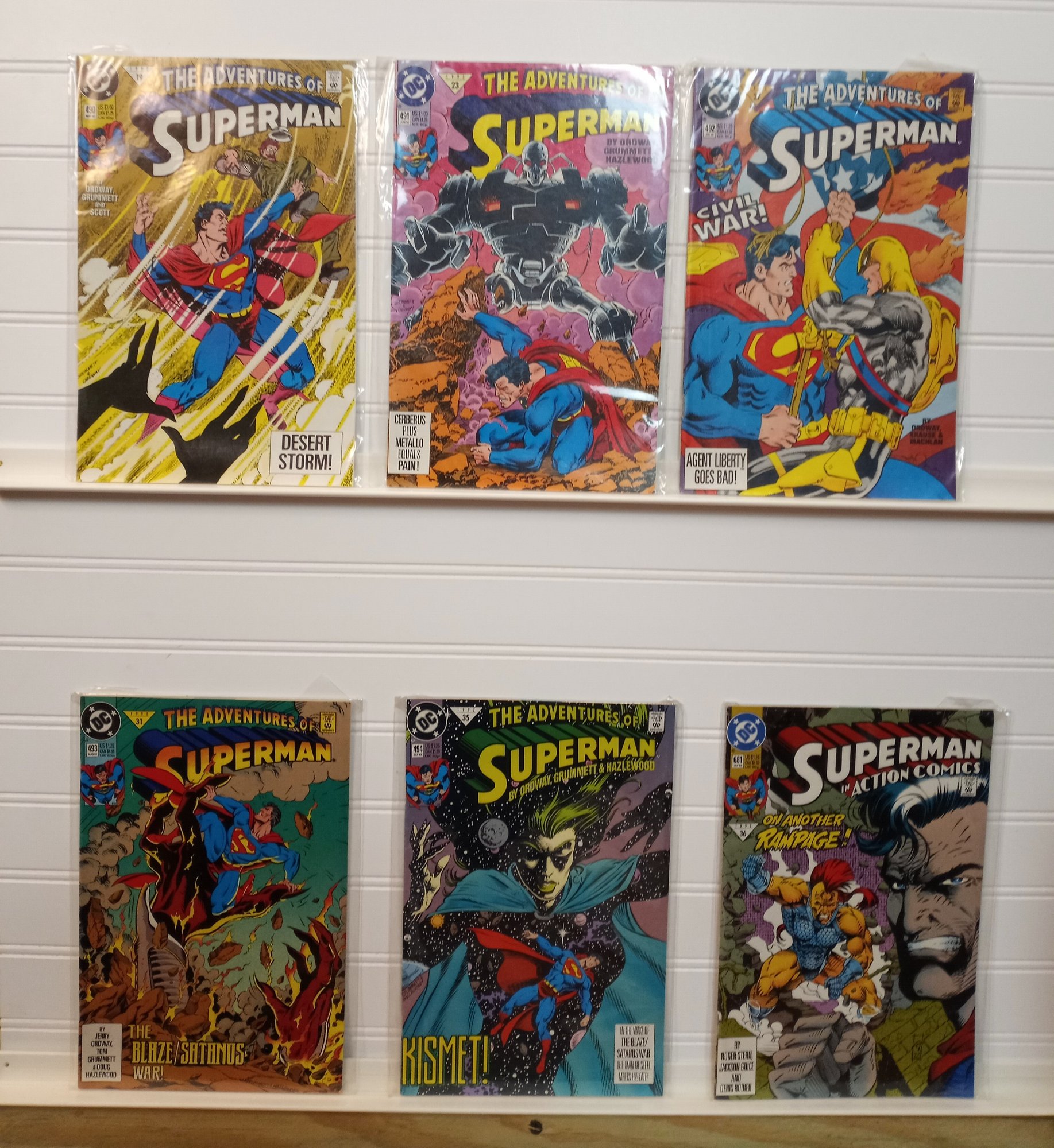 Lot of six Superman comics from the 1990s including issues of The Adventures of Superman and one Action Comics. Covers feature storylines such as Desert Storm, Civil War with Agent Liberty, The Blaze/Satanus War, Kismet, Cerebrus vs. Superman, and Rampage. Vibrant cover art from various DC creators during the post-Crisis era.