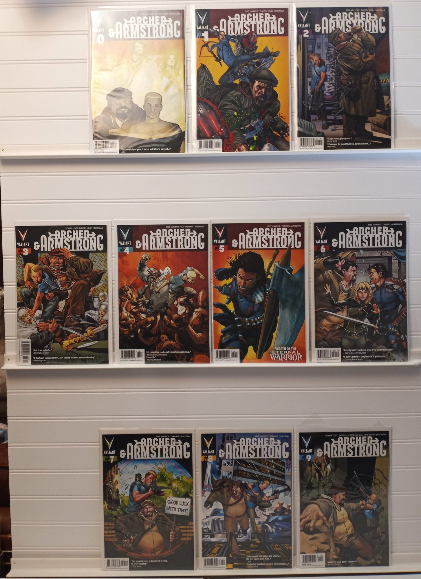 This lot includes Archer & Armstrong issues #0 through 9, published by Valiant Comics beginning in 2012. Written by Fred Van Lente with art by Clayton Henry and Emanuela Lupacchino, the series blends conspiracy-laced satire, action, and comedy as two unlikely allies take on secret societies and ancient threats.
