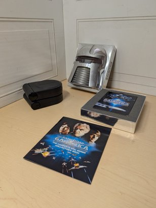 Battlestar Galactica: The Complete Epic Series collector’s edition set, featuring the iconic Cylon helmet case, collector’s book, and DVD holders. Also includes two empty plastic CD/DVD cases shown in the photo. A classic sci-fi collection for fans of the original 1978 series.