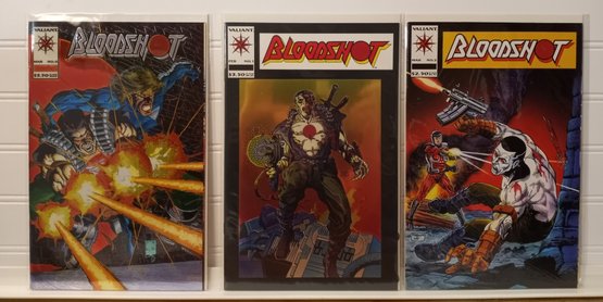This lot includes issues #0 through #2 of Bloodshot, one of the breakout antiheroes of the Valiant Universe. A nanite-infused soldier with erased memories and a violent past, Bloodshot's story blends sci-fi, military thriller, and personal vengeance. Featuring early art by Barry Windsor-Smith and plots by Kevin VanHook.