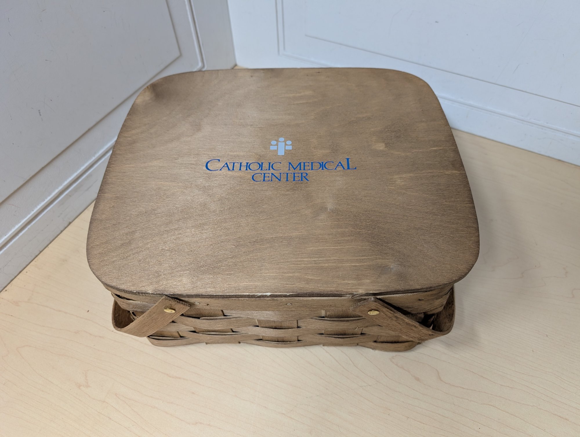 This classic woven picnic basket features a hinged wooden lid with "Catholic Medical Center" branding, a red gingham fabric liner, and includes red plasticware inside. The set includes plastic cups, red plates, and bundled red utensils, all stored neatly inside the 12" x 11" x 6.5" basket.