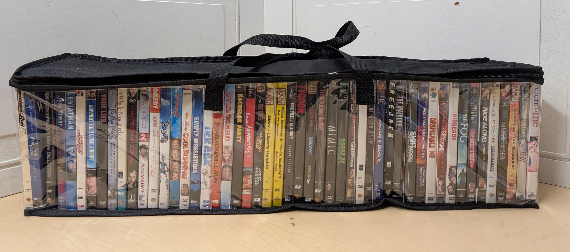 Mixed genre DVD collection including comedy, action, drama, and cult classics. Notable titles include Cool Runnings, True Lies, Mimic, Despicable Me, The Puppet Masters, Bachelor Party, Overboard, The Airheads, Glen Ross, Hollywood Homicide, Return to Me, Jurassic Spark, and Support Your Local Sheriff. Also includes John Wayne Collection, Police Academy, Jakob the Liar, The Whole Nine Yards, Cannonball Run, Ride Along, Mr. Wonderful, Musketeer, and more.