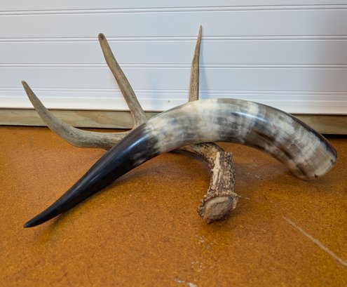 This lot includes one naturally shed deer antler and one genuine bull horn. The deer antler has four points and a weathered patina, while the bull horn features a curved shape with a polished gradient from creamy beige to black. Ruler shown for scale only.