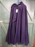 One handcrafted 48" cloak in deep navy by Designs by J. Features a decorative brass clasp closure at the neckline and a full, flowing cut. Maker's label and hang tag included, listing the cloak as period-inspired garb made in Lunenburg, MA.