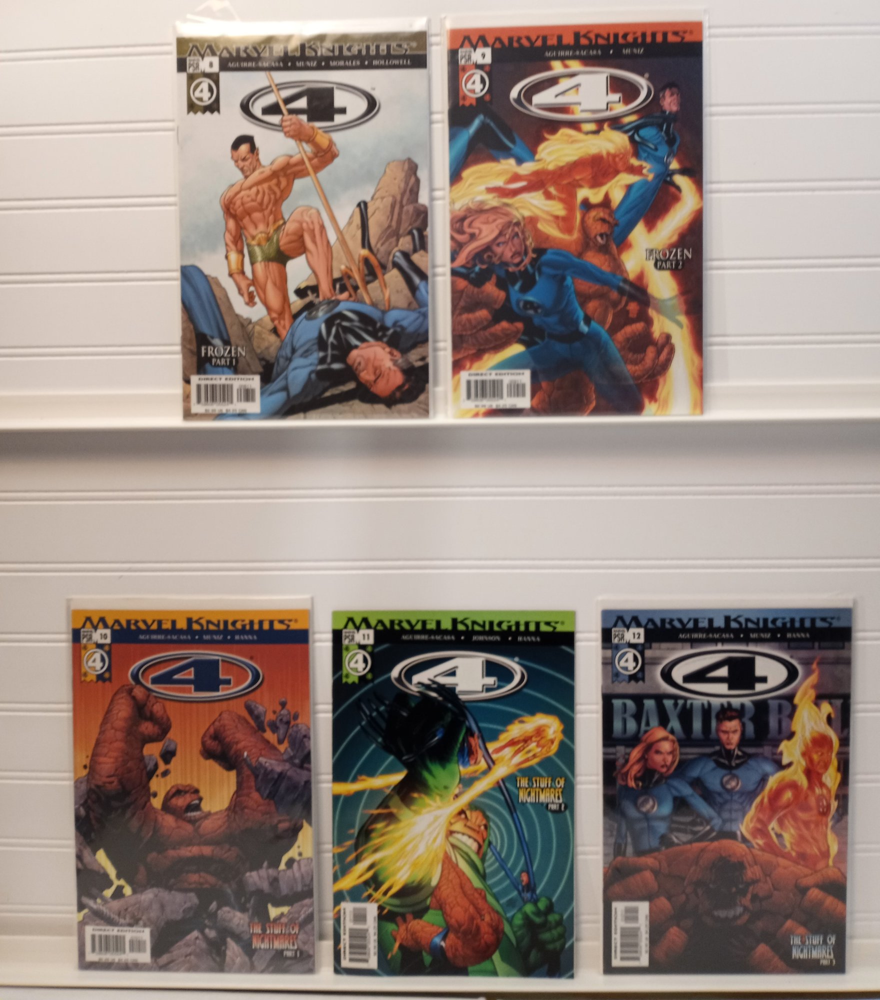 This lot includes Marvel Knights 4 issues #8, 9, 10, 11, and 12, published by Marvel Comics in 2005. Written by Roberto Aguirre-Sacasa with artwork by Steve McNiven and Jim Muniz, these issues feature major arcs including "Frozen" Parts 1 and 2 and "The Stuff of Nightmares" Parts 1 - 3.