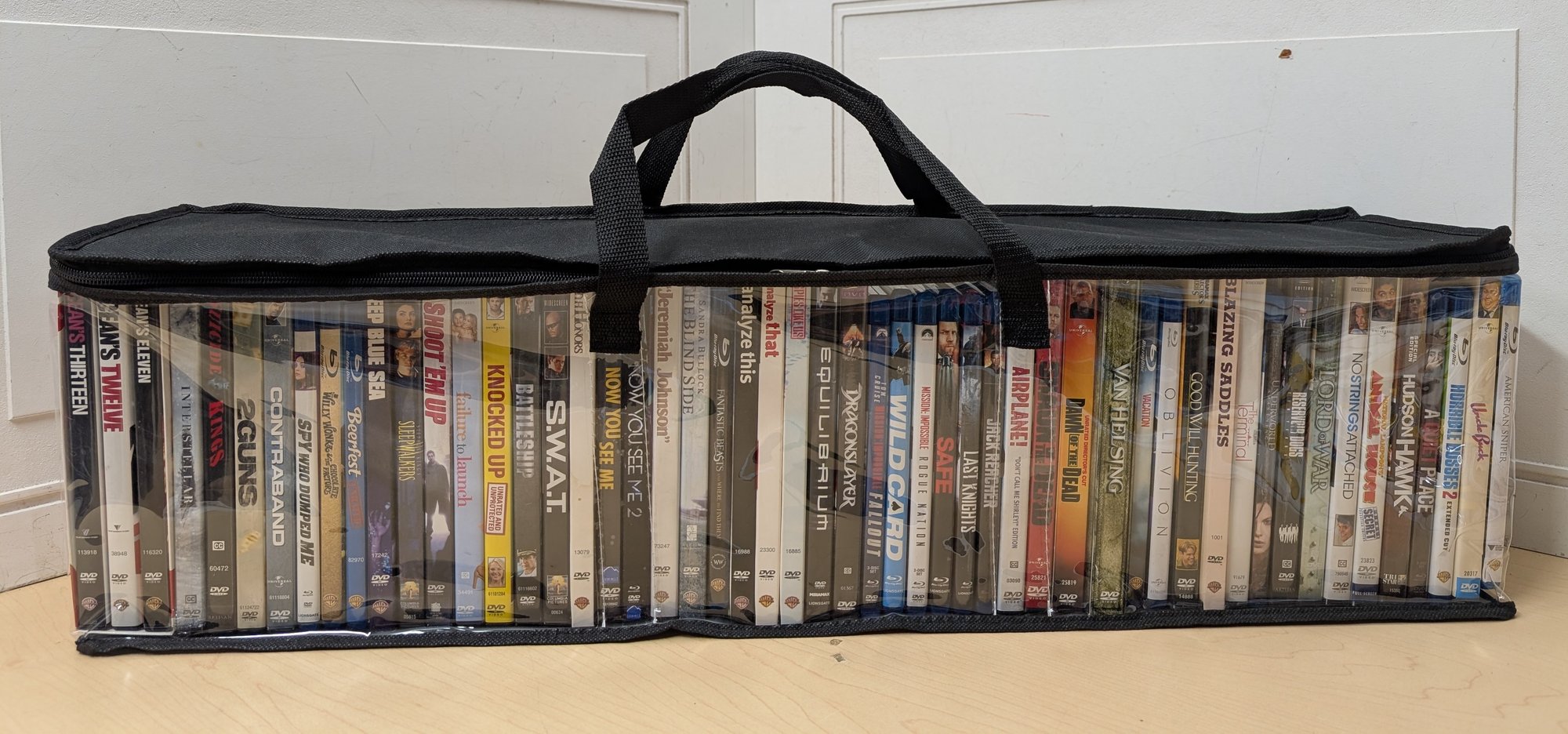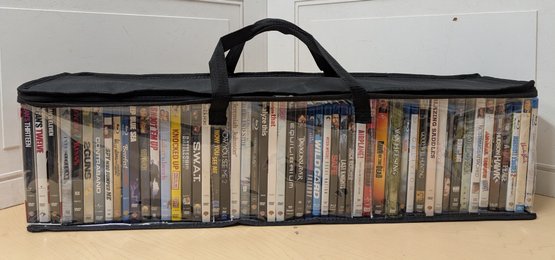 This lot features a zippered soft carrying case filled with about 50 DVDs spanning action, comedy, sci-fi, and more. Titles include Ocean’s Eleven, Now You See Me 2, Knocked Up, Blazing Saddles, Van Helsing, Equilibrium, The Blind Side, A Quiet Place, Good Will Hunting, Contraband, Failure to Launch, Who Dumped Me, Mission: Impossible – Rogue Nation, Safe, American Sniper, and many others. A versatile entertainment bundle perfect for movie collectors or home viewing.