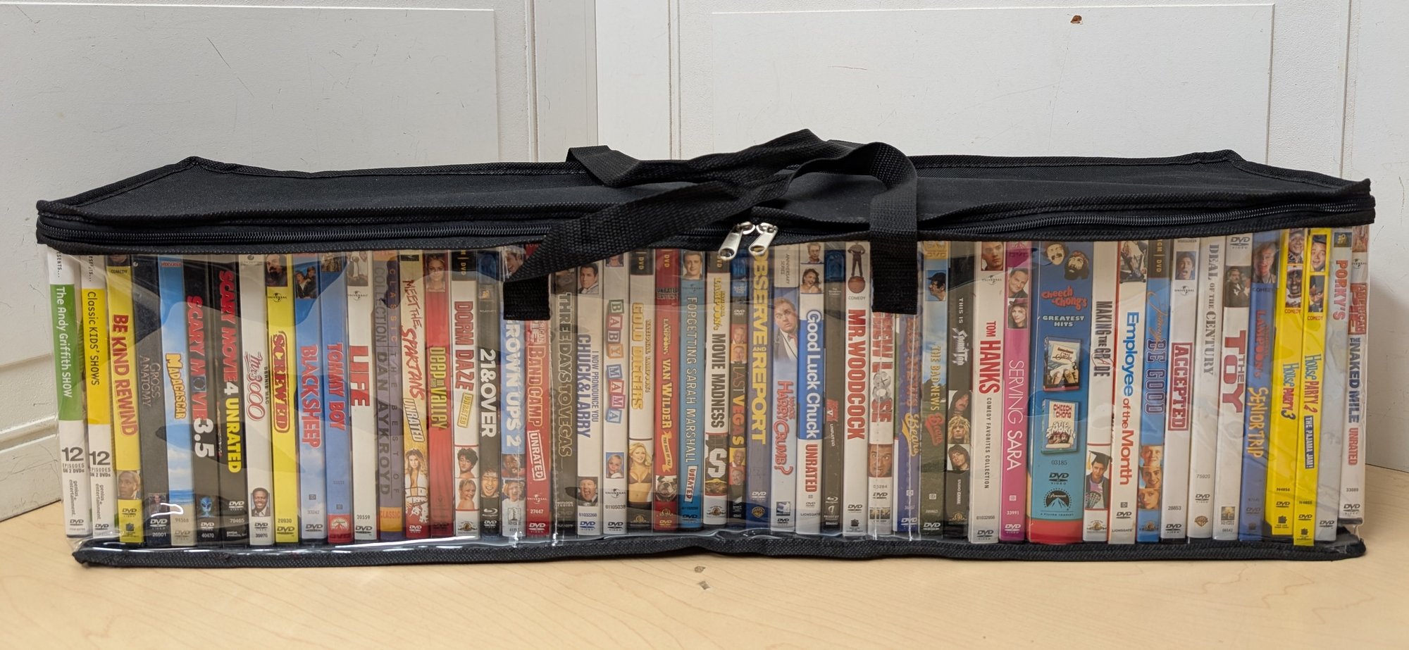 This lot includes a soft zippered carrying case filled with about 50 comedy DVDs. Featured titles include Scary Movie 4, Scary Movie 3.5, Tommy Boy, Black Sheep, Van Wilder, Mr. Woodcock, Accepted, Employee of the Month, Serving Sara, Cheech & Chong’s Greatest Hits, The Toy, Be Kind Rewind, Meet the Spartans, Last Vegas, Good Luck Chuck, and Be Cool. A lighthearted and laughter-filled collection perfect for fans of classic comedies and outrageous humor.