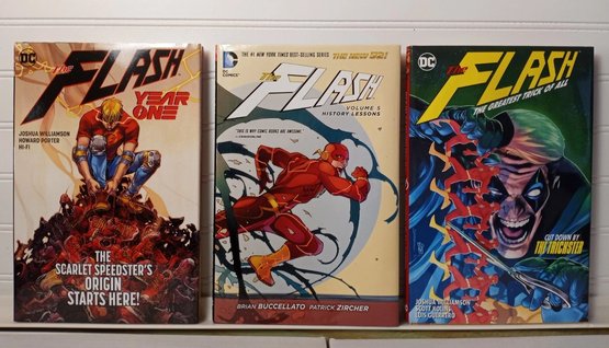 This lot includes three hardcover graphic novels from DC Comics featuring The Flash, each with its original dust jacket. Titles include The Flash: Year One by Joshua Williamson, Howard Porter, and Hi-Fi—an origin retelling that redefines Barry Allen’s path from crime scene investigator to the Fastest Man Alive.