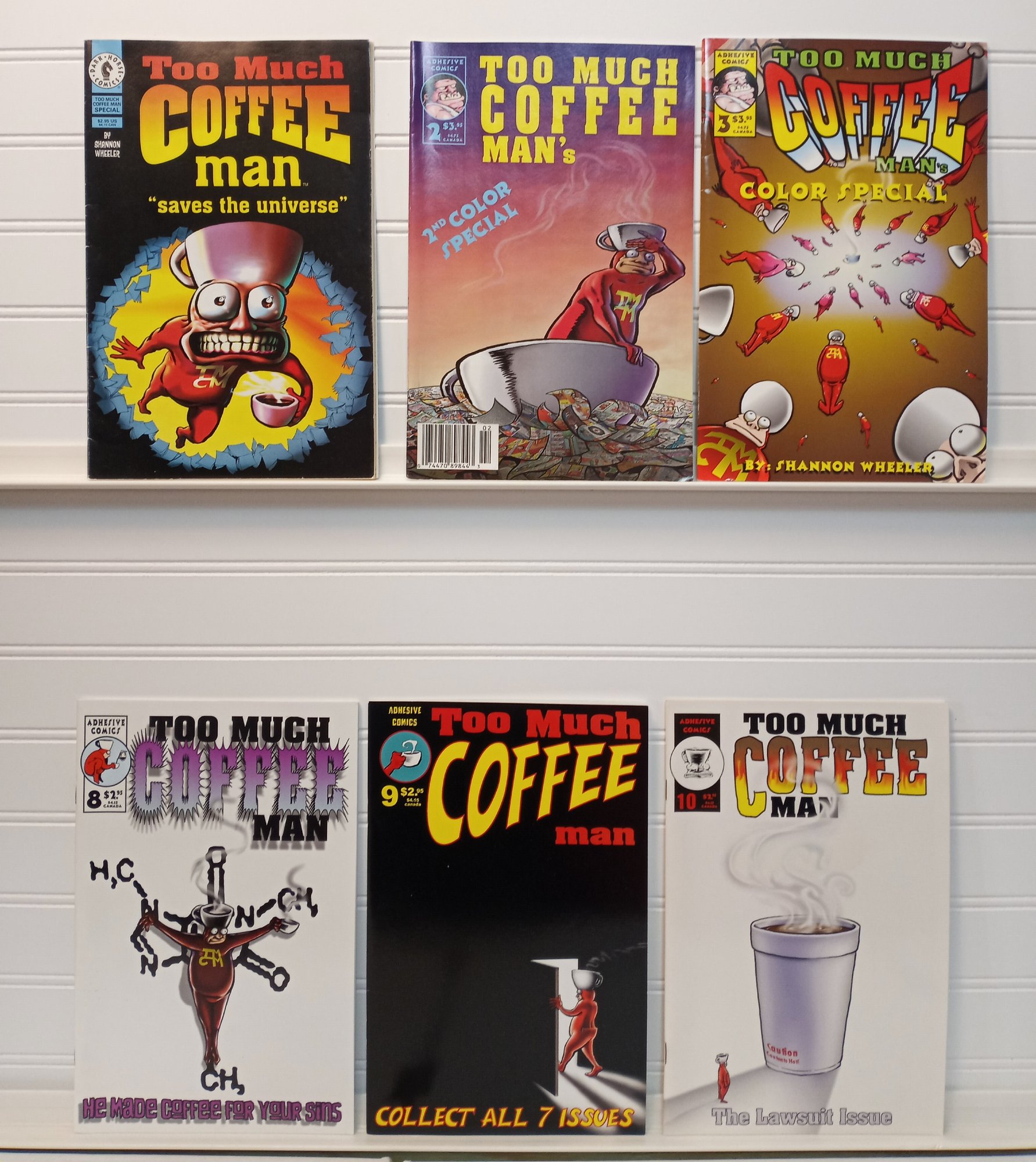 Too Much Coffee Man's Color Special #3: Exploding clones, coffee-fueled mayhem, and existential reflections continue in this early full-color outing from Shannon Wheeler.