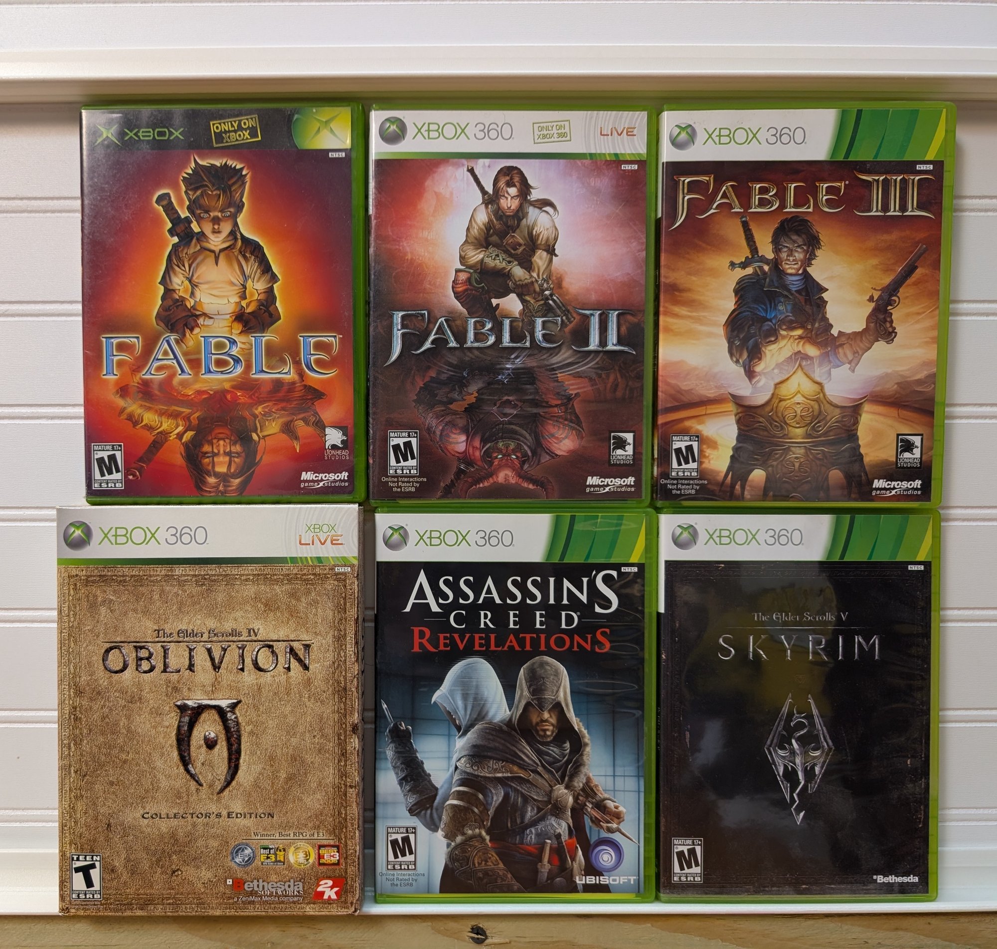 Lot of 6 preowned Xbox 360 games. Includes Fable, Fable II, and Fable III, along with The Elder Scrolls IV: Oblivion Collector's Edition, The Elder Scrolls V: Skyrim, and Assassin's Creed: Revelations.