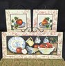 Set of three canvas and wire wall hangings. Many discoloration marks on each piece. Small pieces are 9"x9" and larger pieces is 20"x 9"
