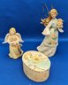 Two angel figurines, taller one is 7.5" tall with missing ends of hair and left hand. Moderate wear and sticker residue on bottom. Smaller figurine is 5" tall 'caring angel's . Many small scuffs and discoloration with sticker residue on bottom. Small trinket box.