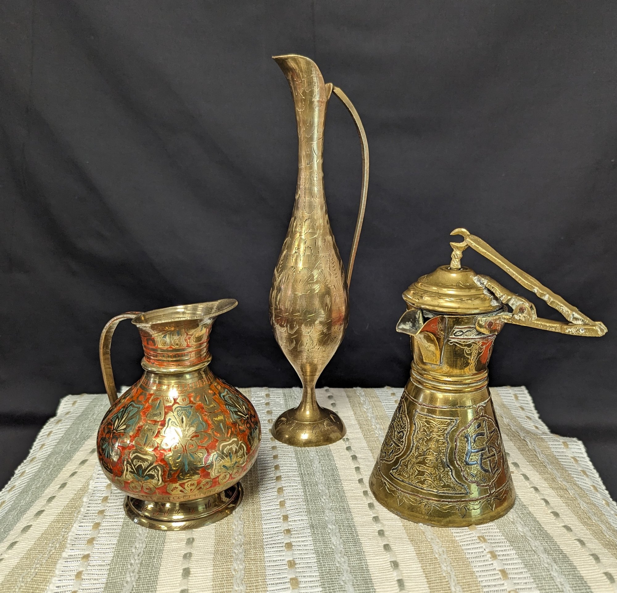 3 uniquely detailed vessel set. 4th picture- very heavy wear on the inside of vessel, and around the hardware/fastener. Dimensions listed in pictures.