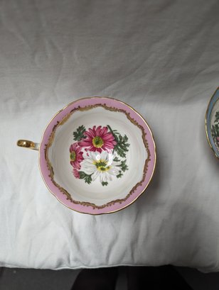 2 bone china floral teacups, blue and pink. Foley bone china EB. Some minor ware on the handle on both teacups. One Melba serving cup with floral design (pictured the middle of the two teacups). Minor ware on the handle and minor chip on the front lip.