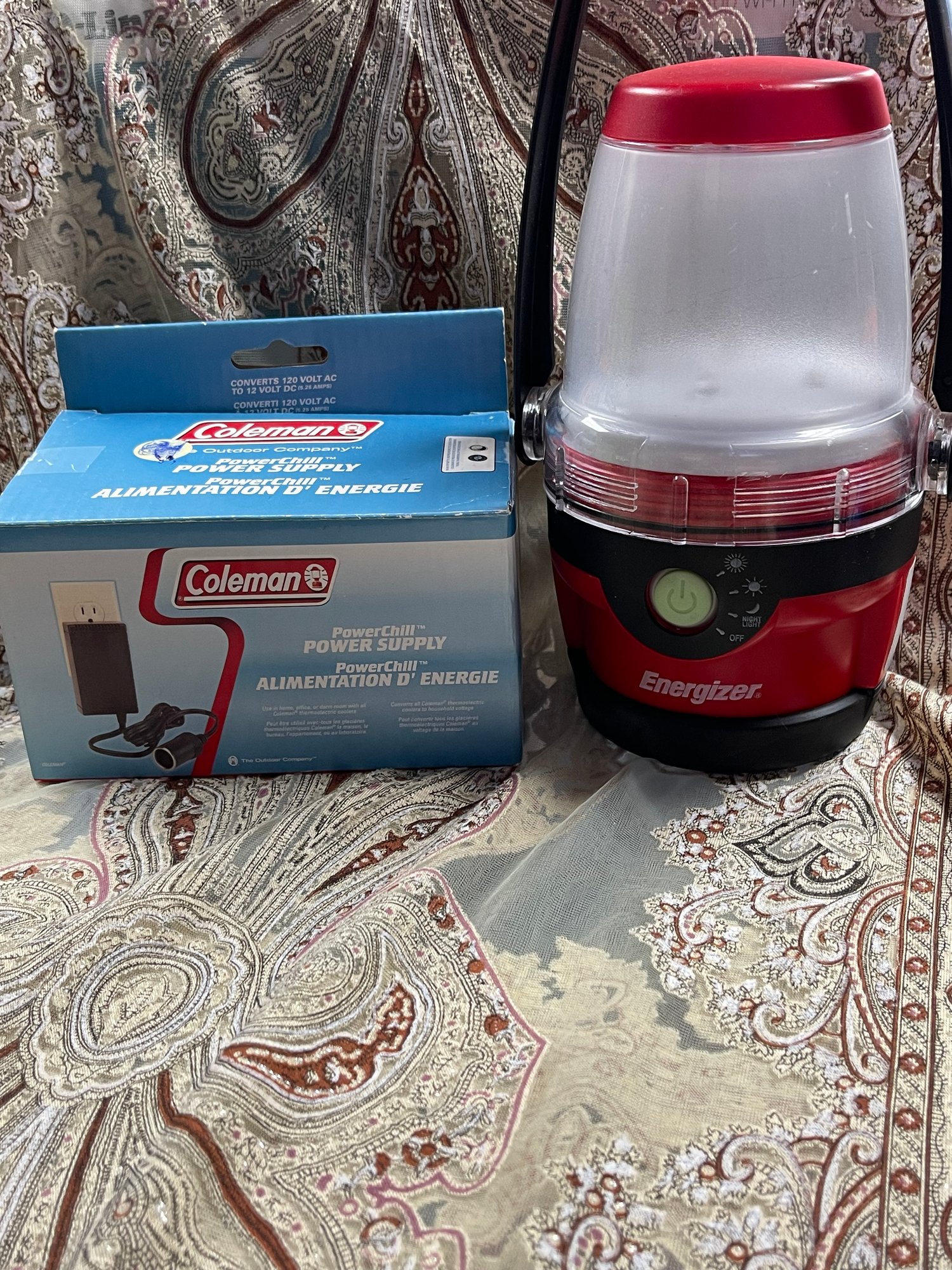 Battery operated lantern with a Coleman power supply adapter.