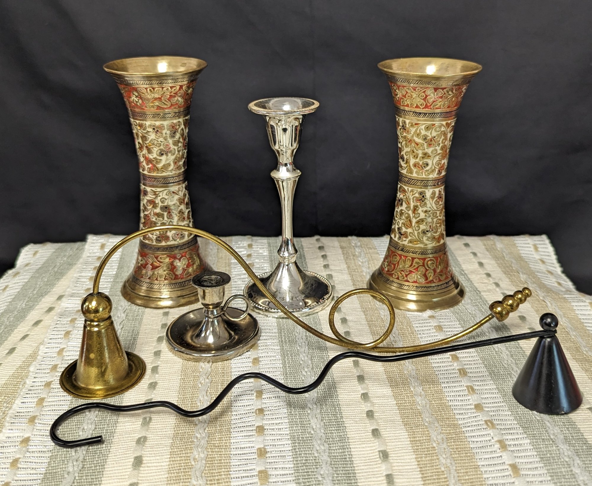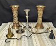 Two 6" brass candle holders, two smaller silver in color holders (see picture) and two candle stoppers one black one gold in color both about 10" long.