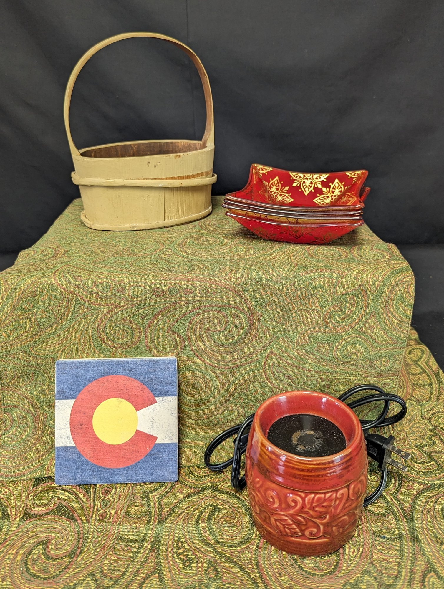 Miscellaneous decor lot. Basket is falling apart in places see picture. 4 red glass dishes/coasters. Some sticker residue- about 4" x4" Colorado flag coaster a bit smaller than red. Wax melter has some ware but does turn on.