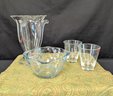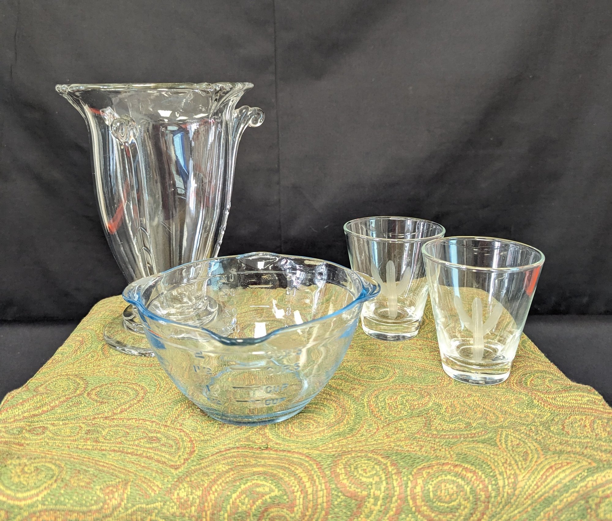 Fireking measuring bowl 16oz, two Blakely clear etched cactus 6oz glasses (2), glass vase about 8" tall. All in great condition.