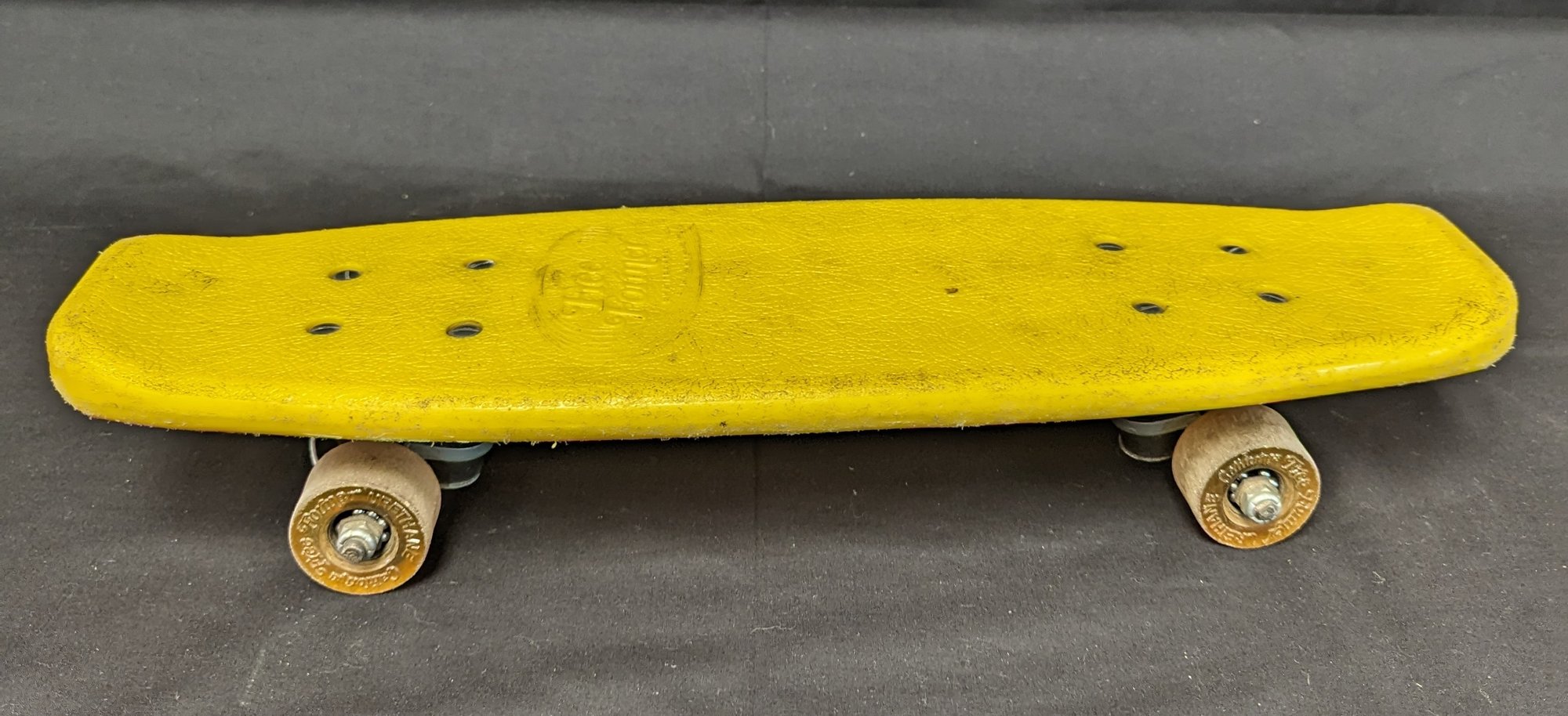 Yellow California free former skateboard about 20" long about 6" wide wheels and board are in fair condition, noticable ware and scuffs