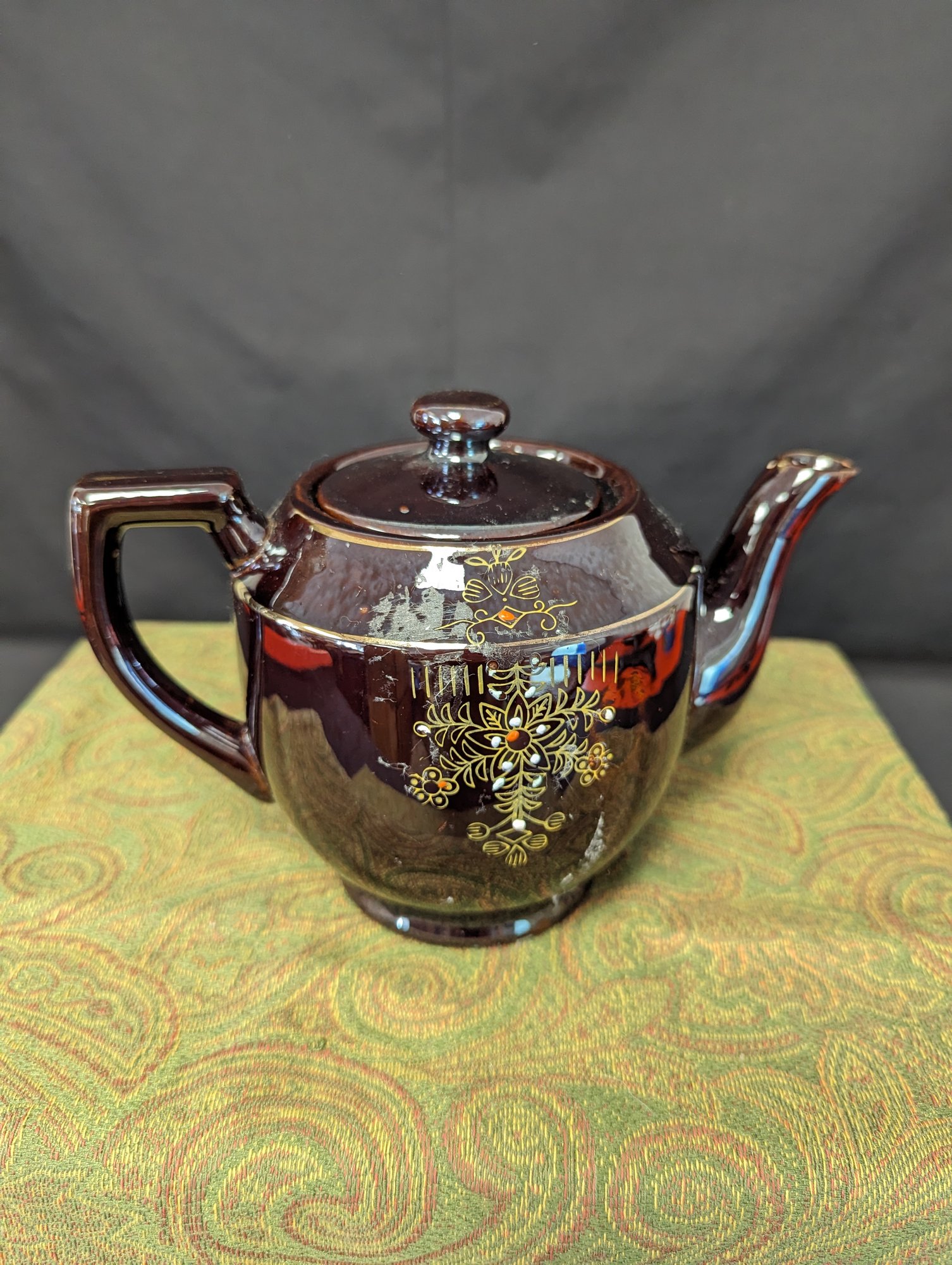 Black/brown teapot with floral design. Pot has many areas of tape residue!!!- see picture.