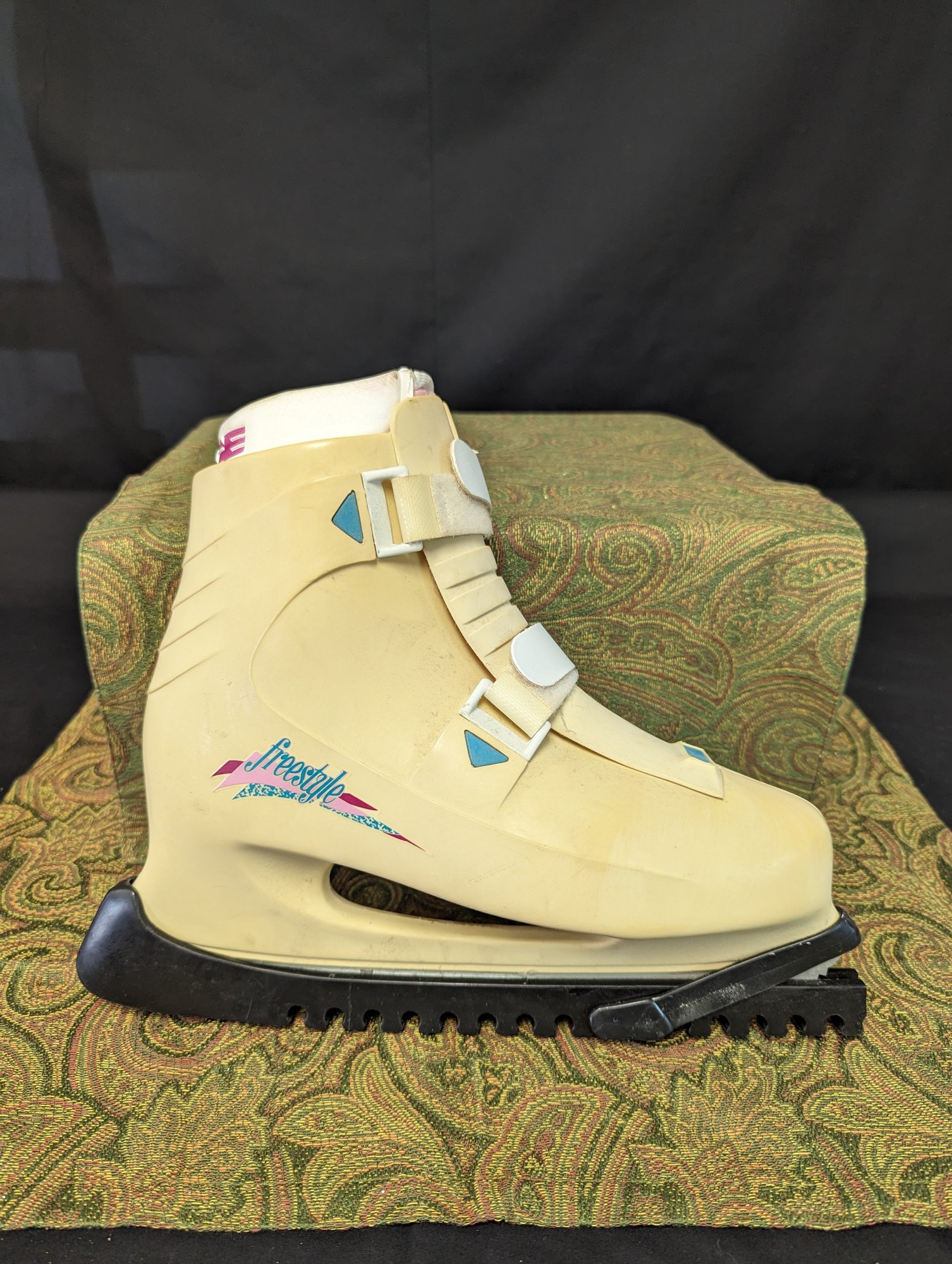 Lange freestyle ice skates size 10 with Bauer carrying case. Blade covers included. Velcro straps are in good shape. Moderate ware on the skates themselves