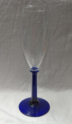 Blue and clear glass champagne flute. Sticker residue stuck to bottom of glass. Stem and base is royal blue, top is clear glass.